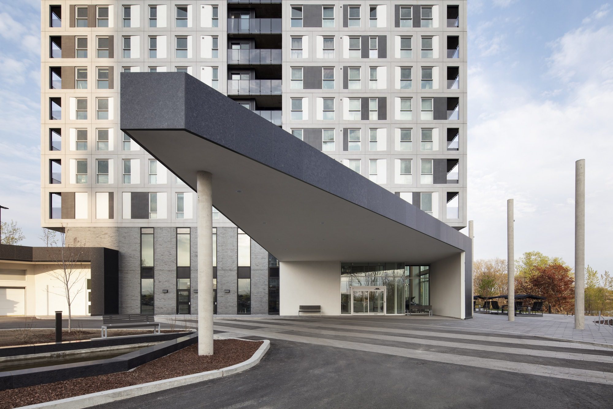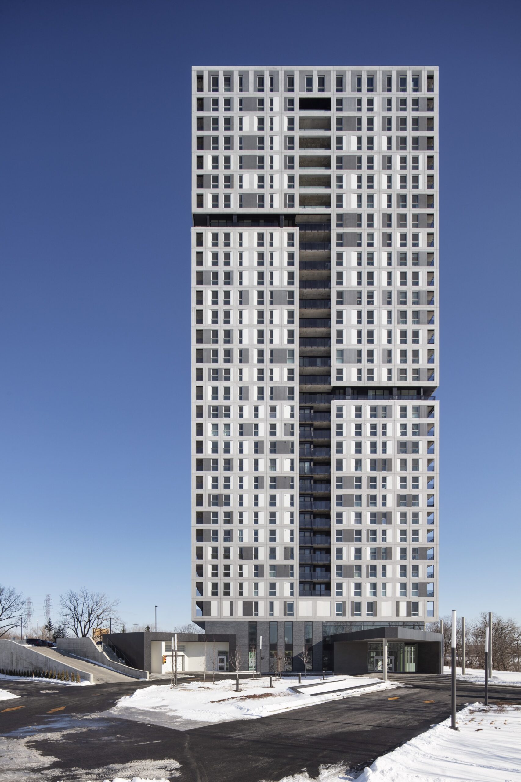 Panorama’s contrasting façade is a visual magnet, transforming simplicity into perceptions of a three-dimensional tower. The building’s east and west façades, composed of precast concrete panels in three different shades, create a sense of movement through staggered window positioning from one floor to another. With the addition of contrasting lateral panels, the tower invokes a visual interpretation of a cloudy sky hanging above the landscape. To the north and south, Panorama is marked by linear balconies, concrete paneling and darkened windows, providing further contrast to the clear windows of the east and west façades.