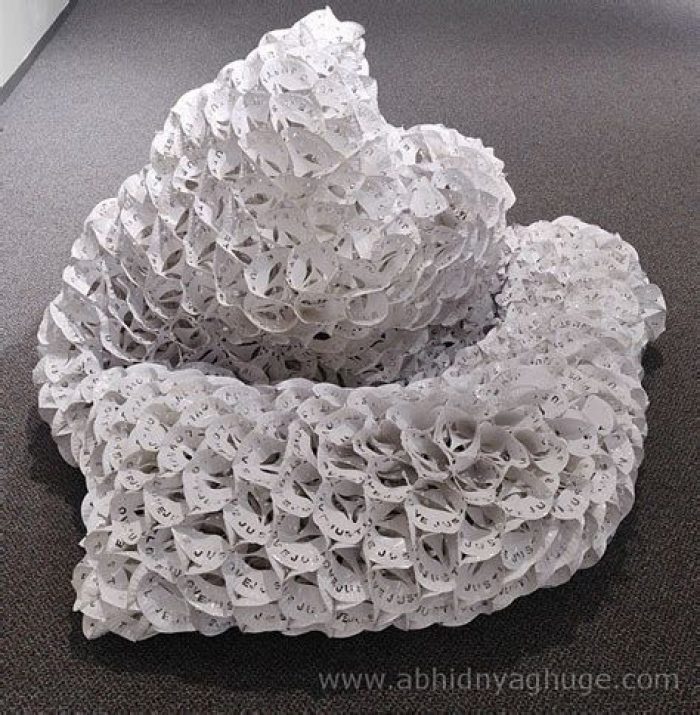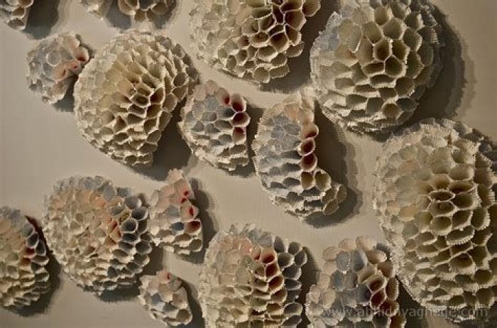 Inspired by the cellular systems of the natural world, Ghuge deploys various print making techniques on hand made paper plates that she assembles into reef like forms suggestive of sponges or shellfish clusters or improbably massive wasp nests. It is all about home and how creatures large and small situate themselves within their environment as well as psychically within themselves. This process of situating oneself within routinely shifting conditions is common to all life forms and Ghuge’s meditative immersion in this most fundamental of creative processes offers intuitive insights and even intimations of solace.