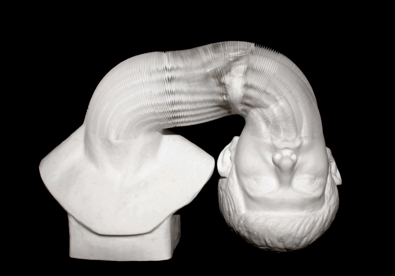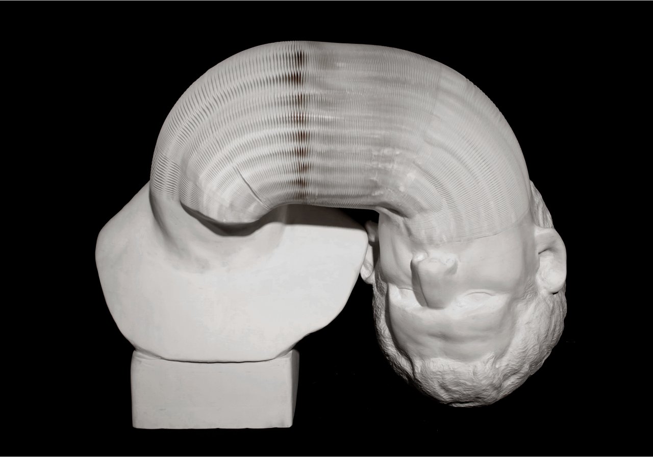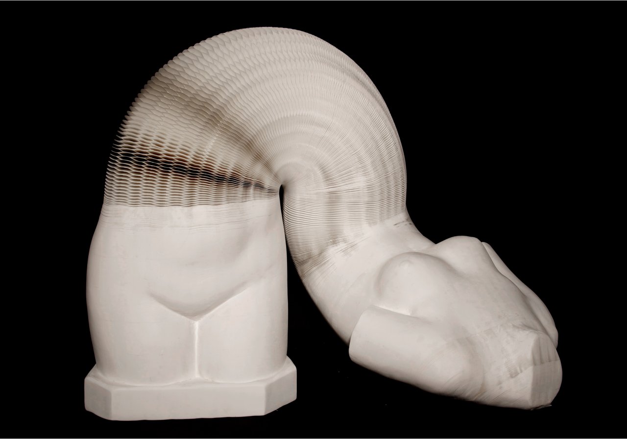 Using an electric saw, he carved these stacks into identical human figures. This way the structure becomes elastic forms, which makes it transform the paper to stretch, twist, get longer and withdraw yet still take the appearance of porcelain.