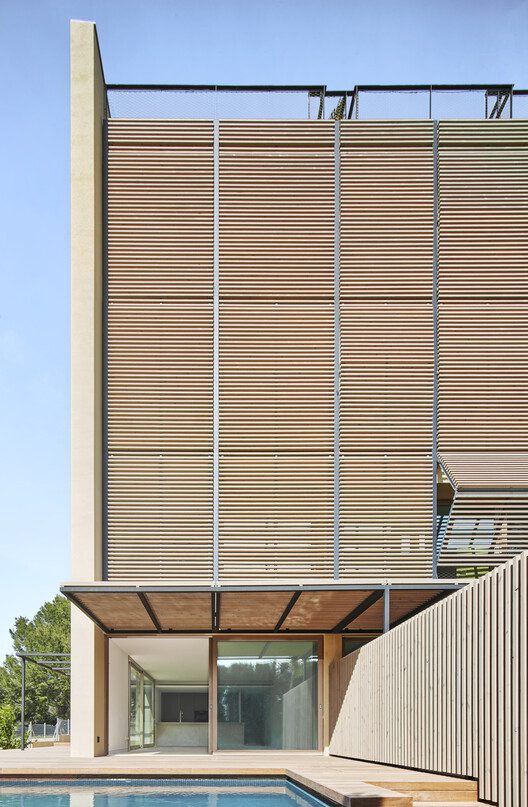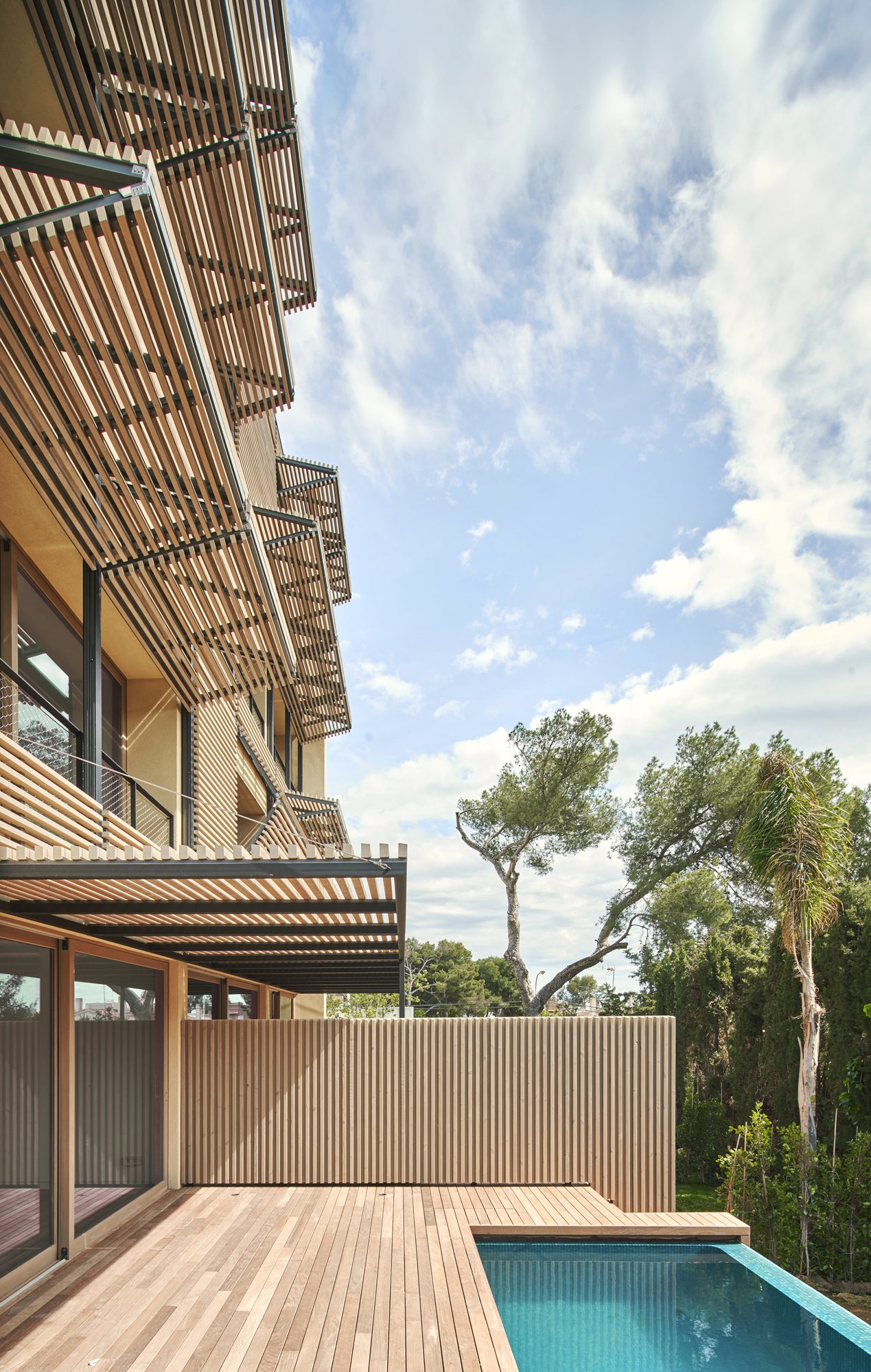 The main facades, located in the best orientations, views, and gardens, are composed of folding wooden blinds with horizontal slats that act as a sun filter, generating a dynamic effect that evokes the pergolas and traditional lattices of the Mediterranean. This solution allows for regulating privacy and controlling the entry of sunlight throughout the year.