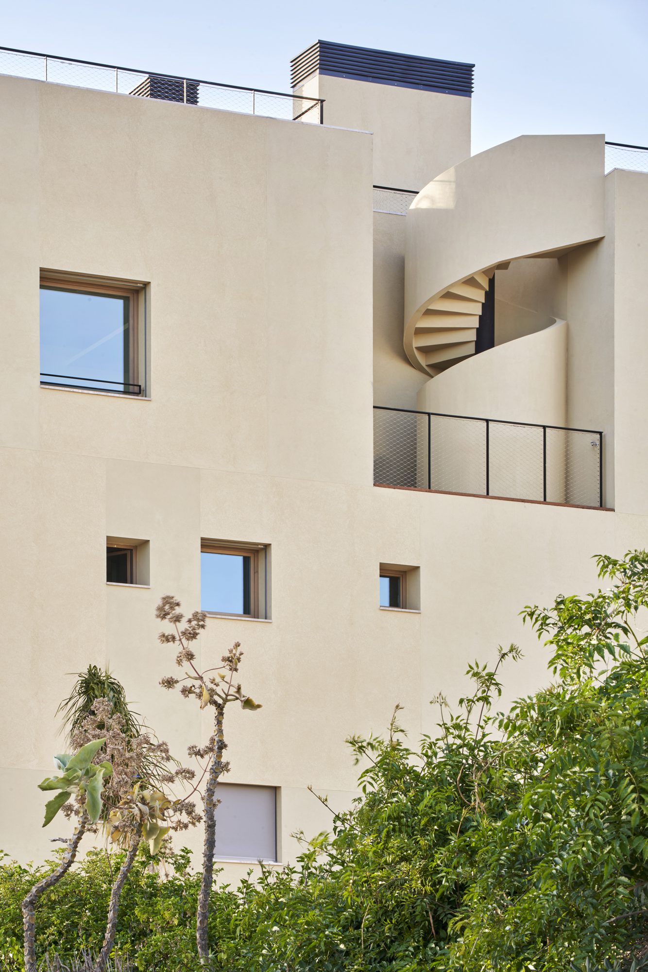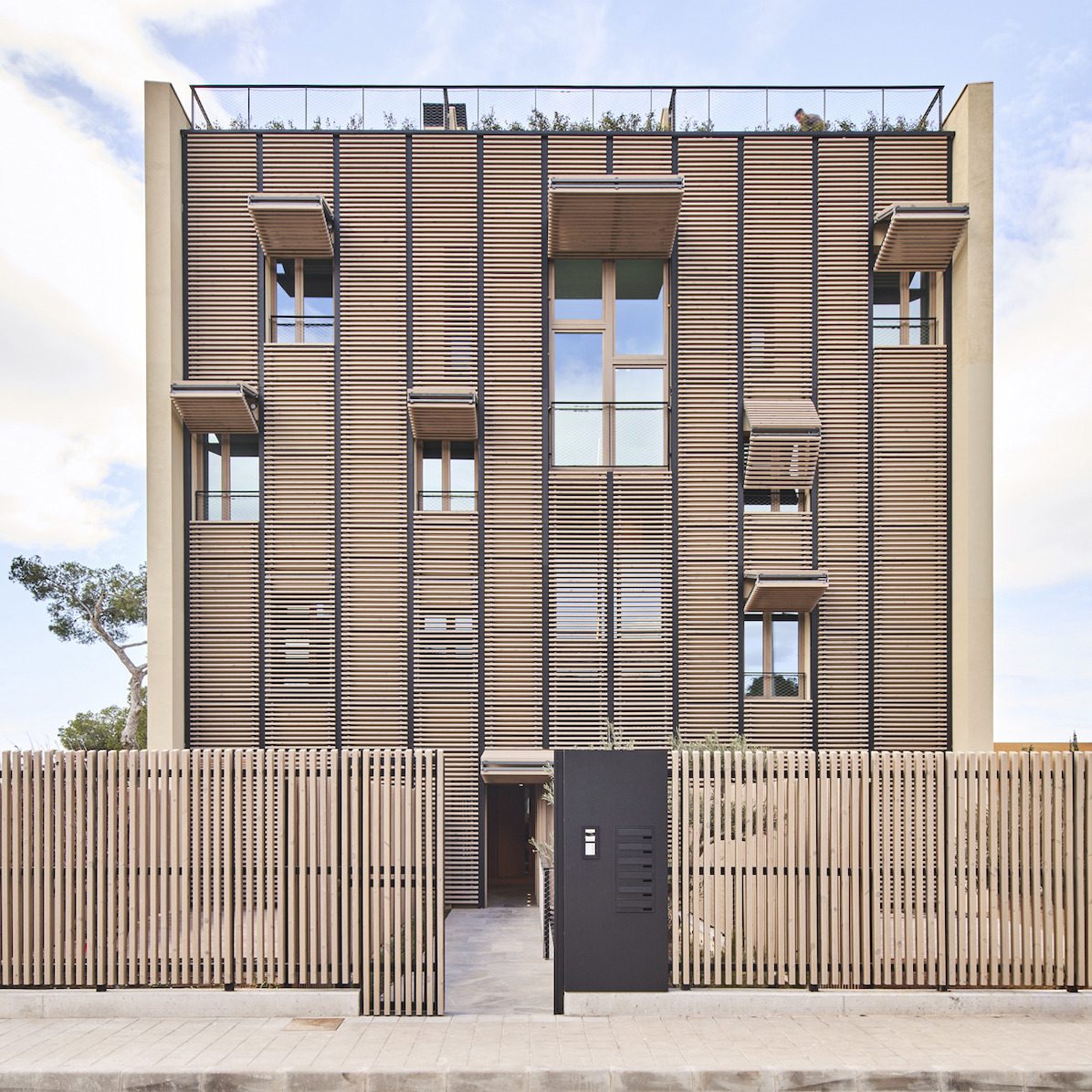 Paral-lel Building is a residential project in the quiet neighborhood of La Bonanova, southwest of Palma, with two independent blocks. Taking advantage of the pb+3 regulations, the buildings are designed so that the 12 houses, despite the density and limited space, enjoy sustainability, energy efficiency, and privacy with small-sized private gardens and pools. Some houses are duplexes, 6 on the ground floor with garden and pool, and 6 penthouses with rooftop pools and panoramic views of the bay of Palma, Cala Mayor, and Illetas.