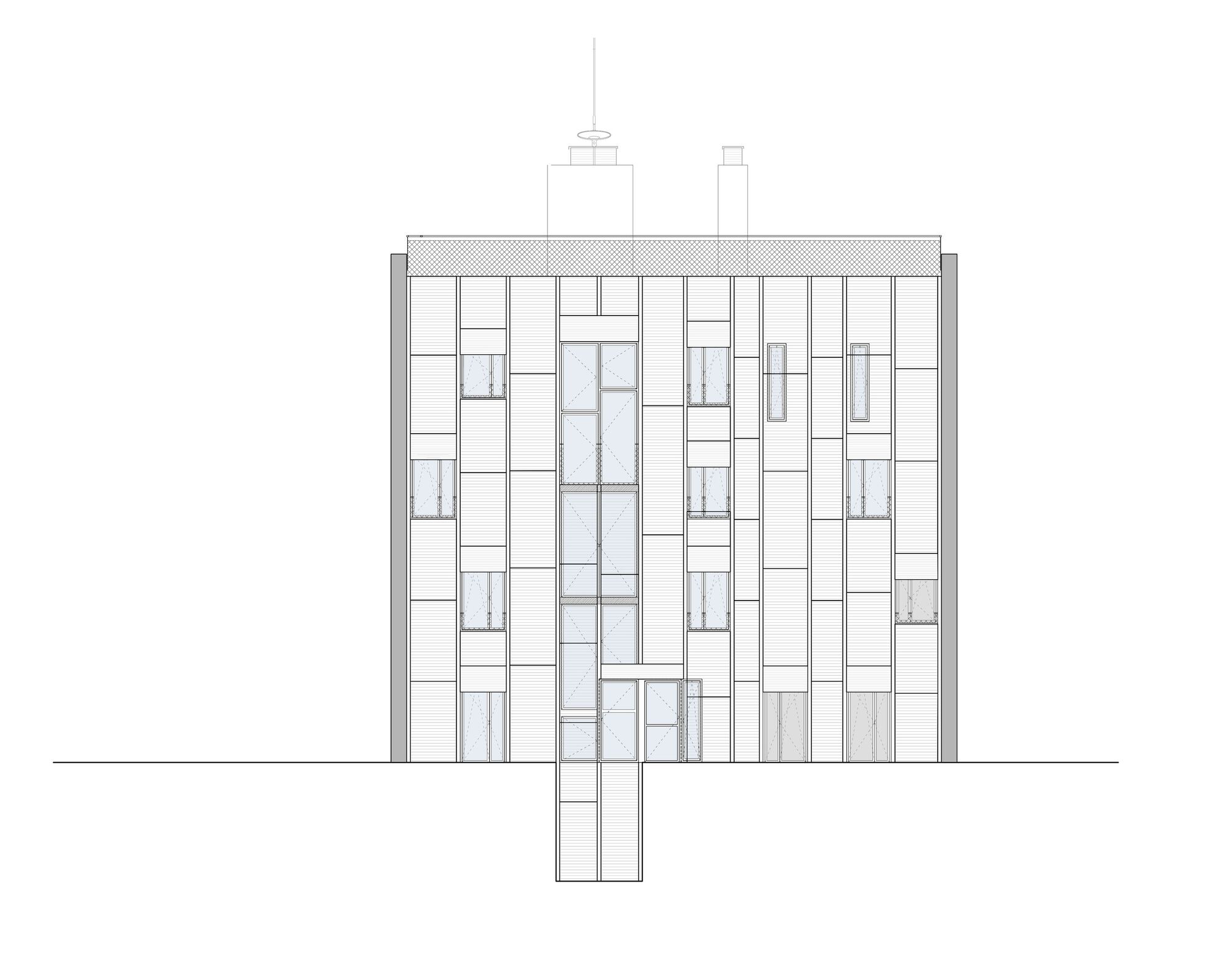 The lateral facades of the building present a strategy that allows integration into the urban context. In this sense, more solid and hermetic facades have been designed that limit the views towards the closest neighbors and the adjacent streets, guaranteeing the privacy of the users.