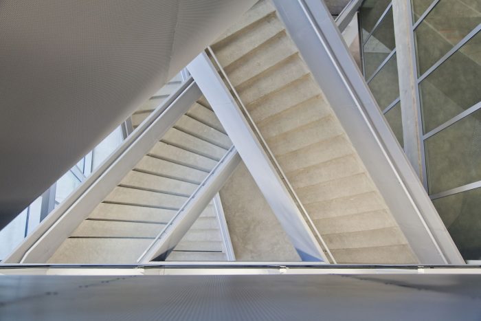 The filling of the non-glazed parts is made with insulating sandwich panels composed of an exterior face of ALUCOBOND – Natural Line 401 and an inside face made of rough galvanized sheet, separated by a rock wool of 30mm.