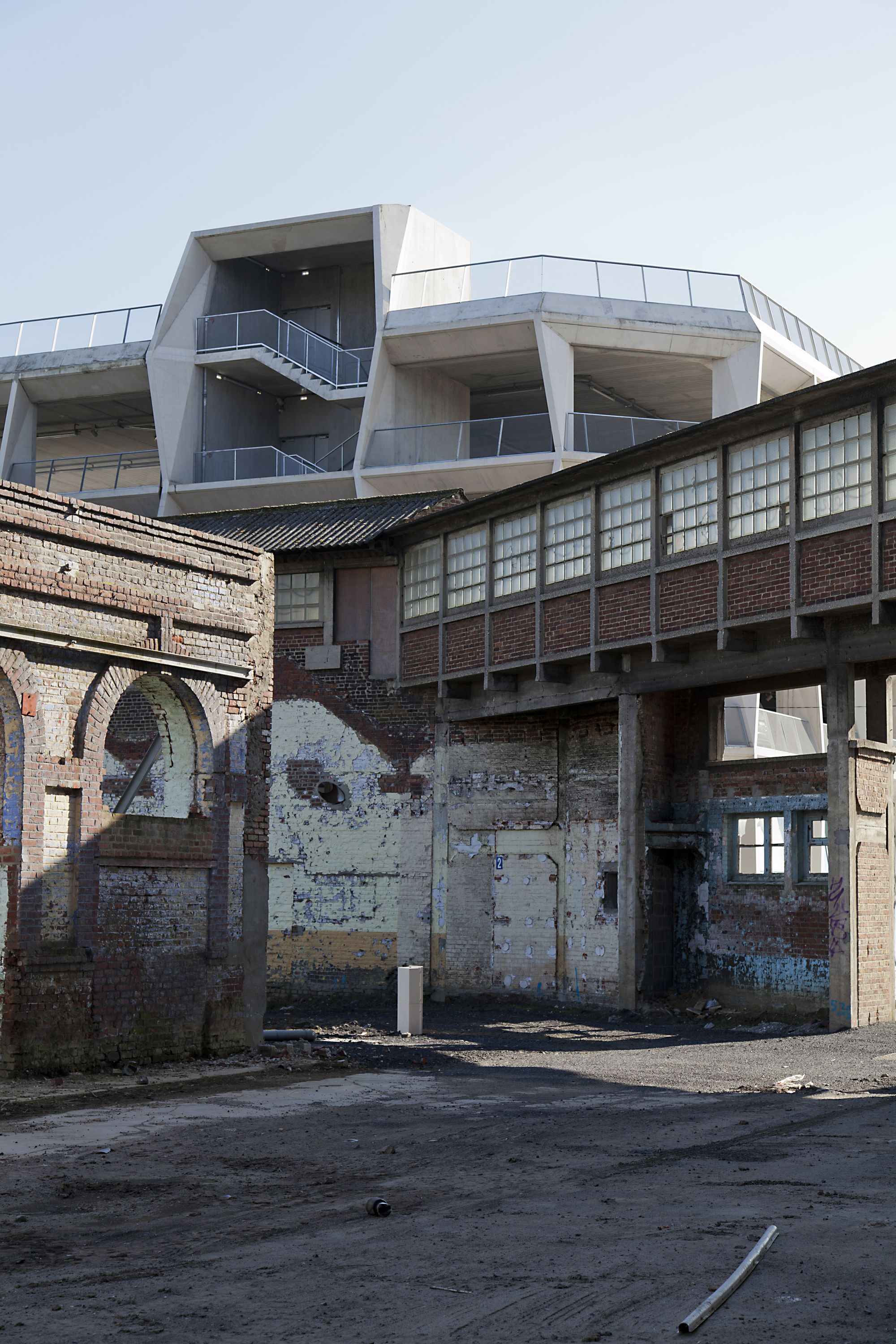 The hive of small enterprises is located in the heart of the site La Tossée in Tourcoing (North of France). The program brings together a hive of innovative textile companies and a 450-spaces-silo parking. The two programs are combined within a single entity.