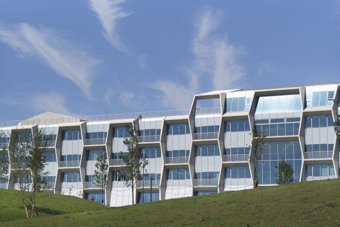 The filling of the cast-in-place concrete cells is achieved by a two-level curtain wall façade consisting of a frame of the WICONA – MECANO 2 range, with WICLINE 65 hinged windows.