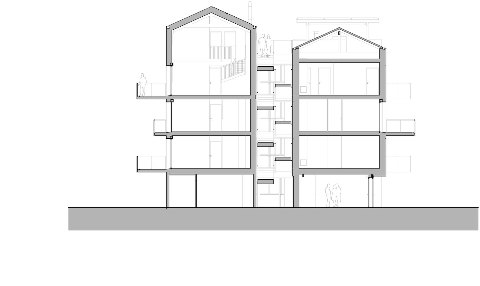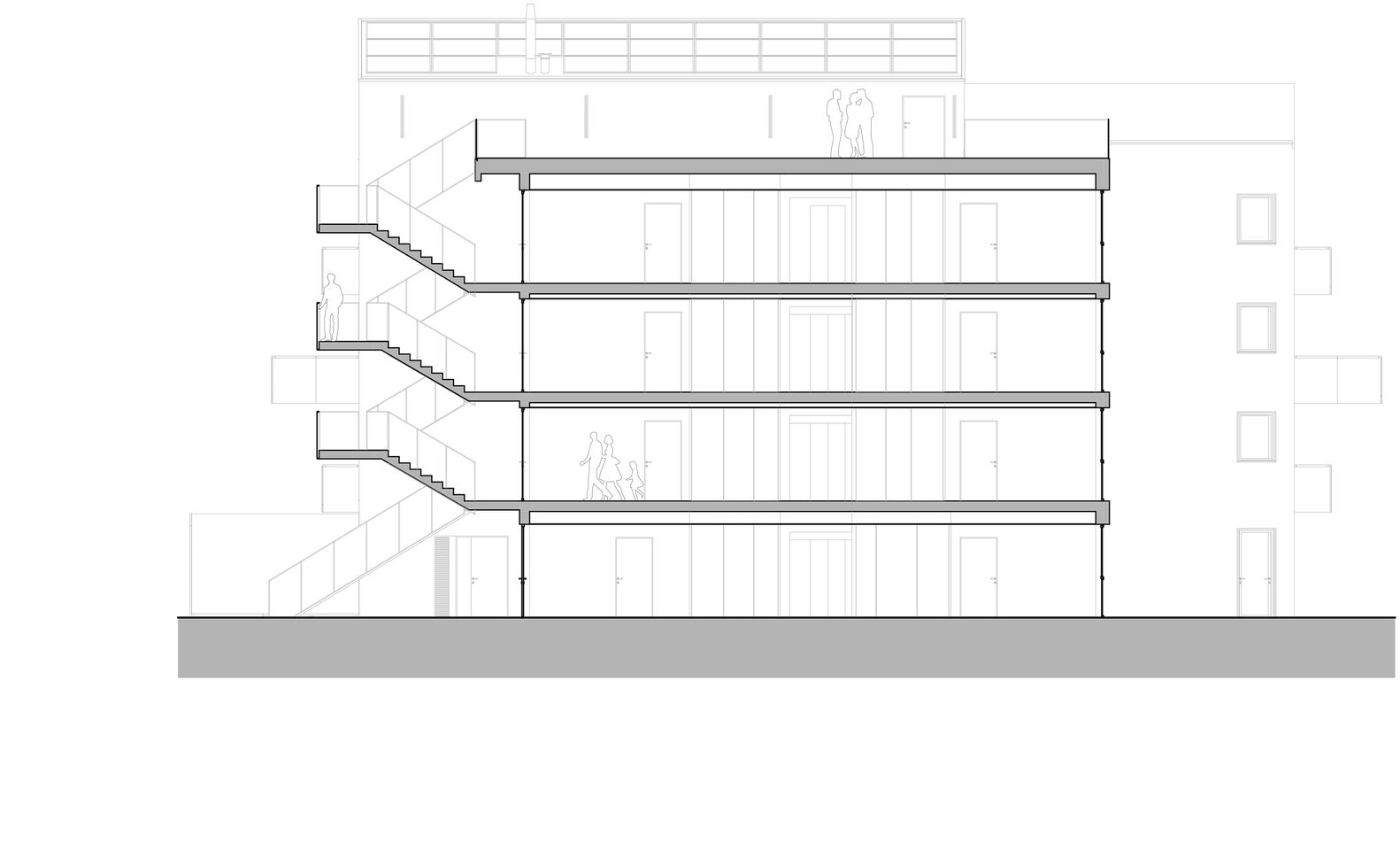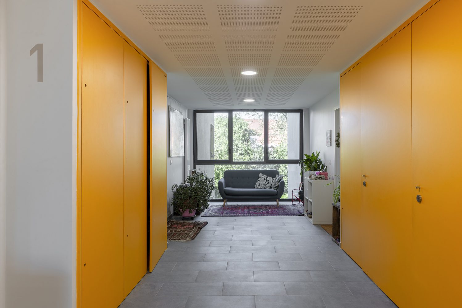 Accessible by an external staircase, each floor leads to a central common area, designed as an additional living space for the four apartments on the same level. These common areas are equipped with large storage cupboards and shared amenities (washing machines, freezer, etc.) and have been converted by the residents into a reading corner, co-working space, and children’s playroom.