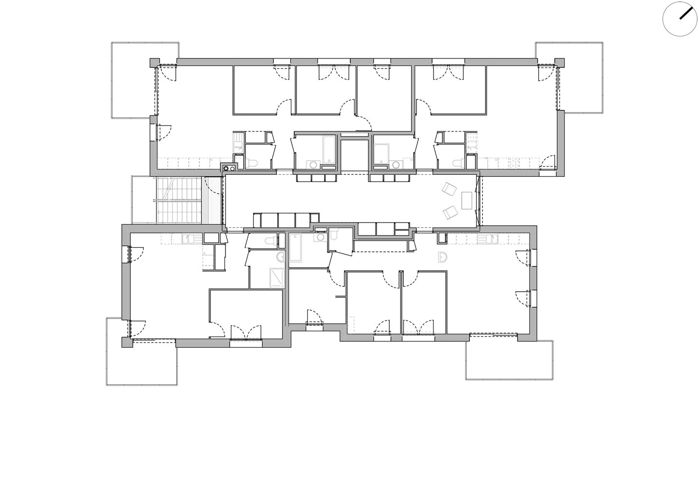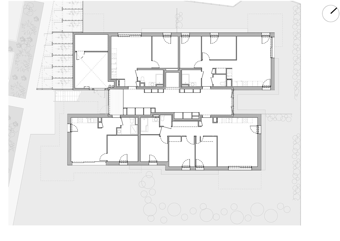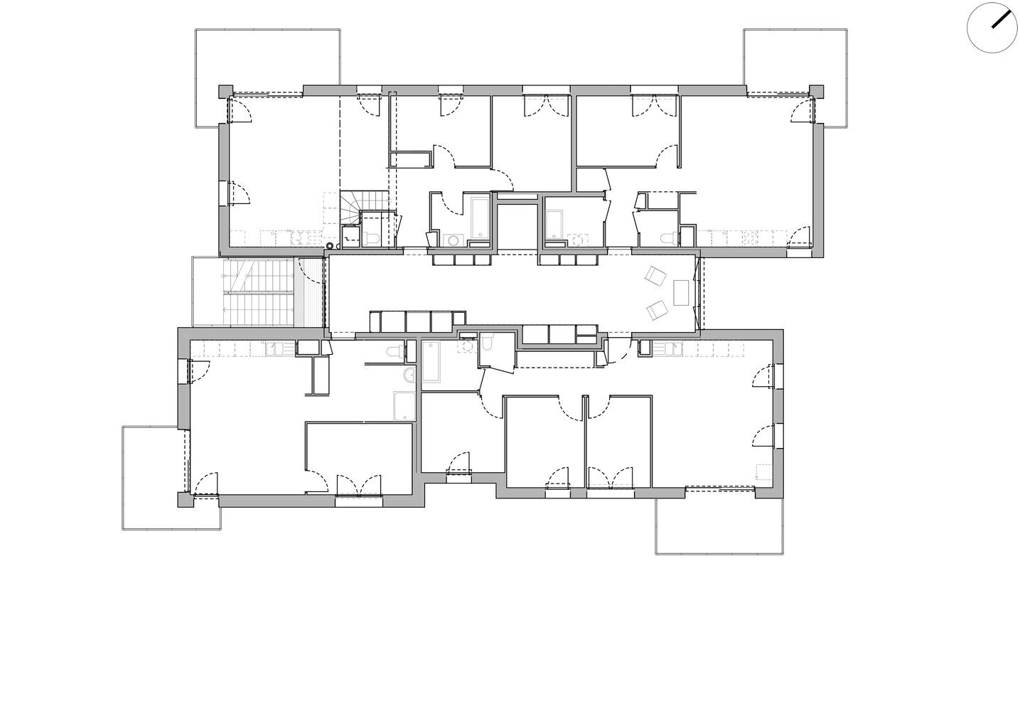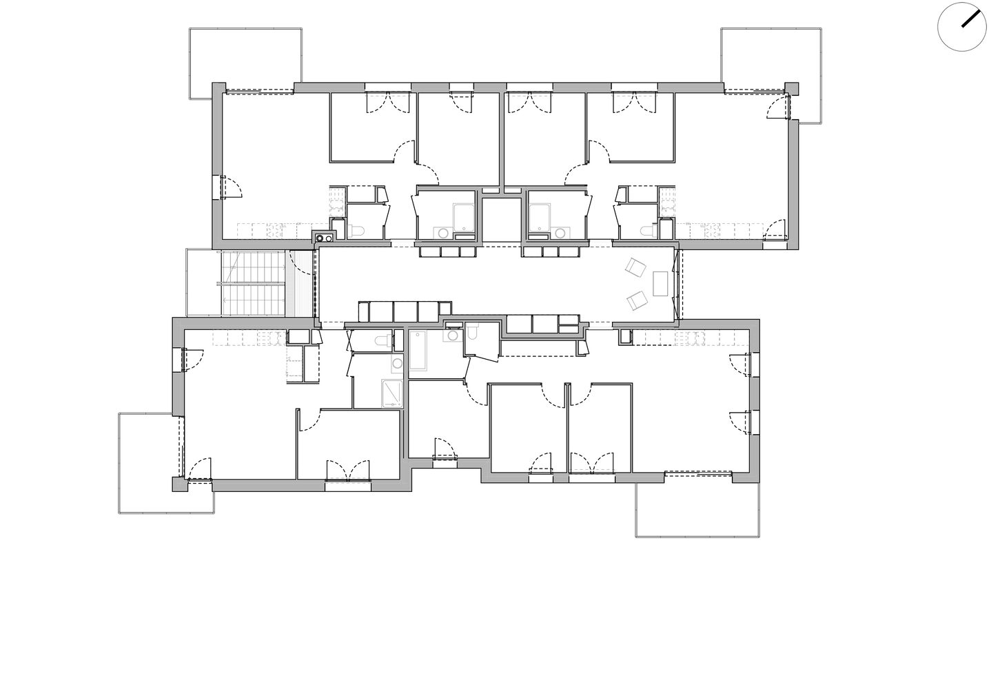 Accessible by an external staircase, each floor leads to a central common area, designed as an additional living space for the four apartments on the same level. These common areas are equipped with large storage cupboards and shared amenities (washing machines, freezer, etc.) and have been converted by the residents into a reading corner, co-working space, and children’s playroom.