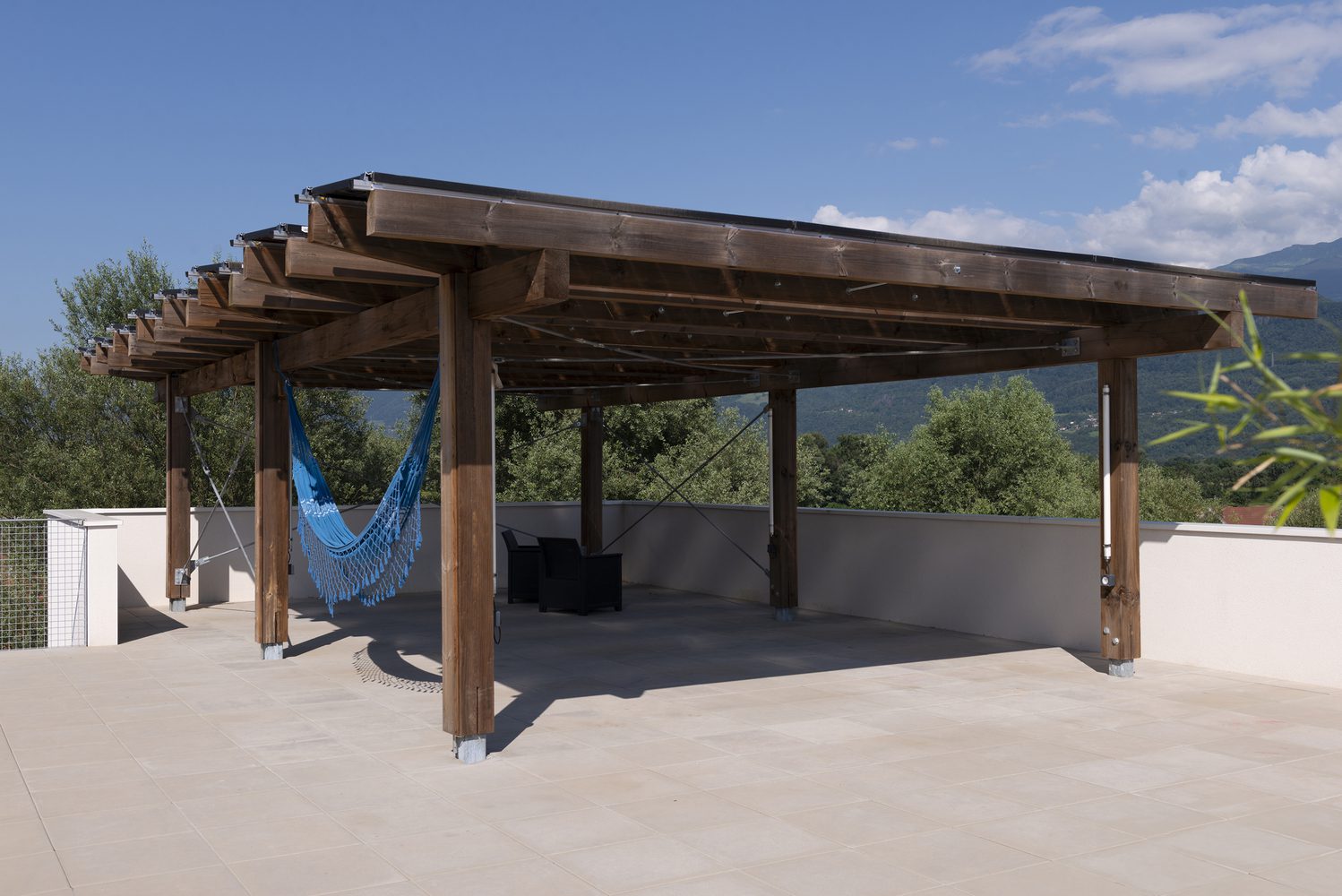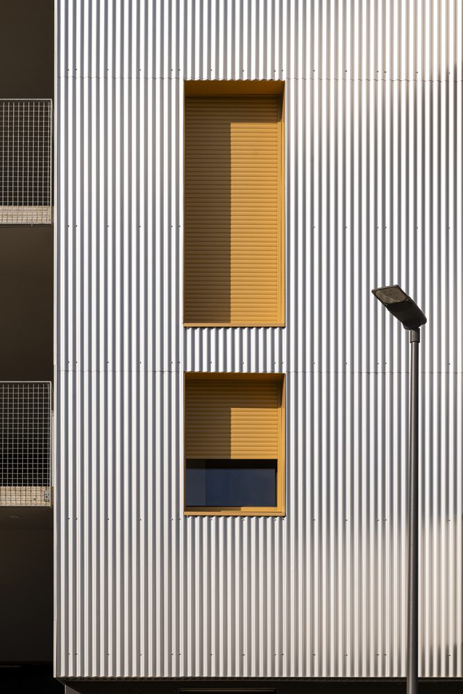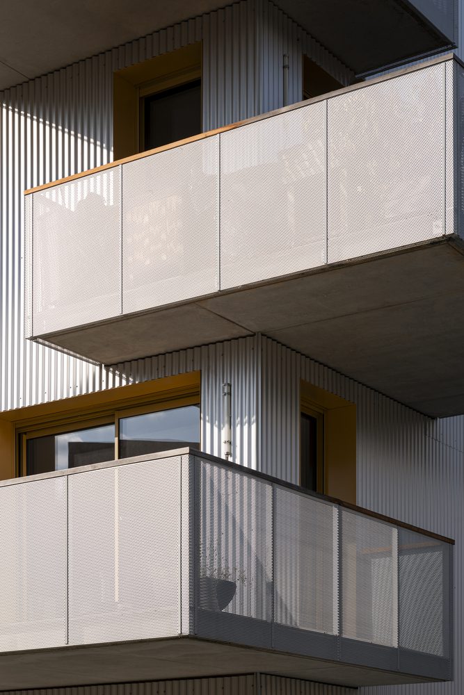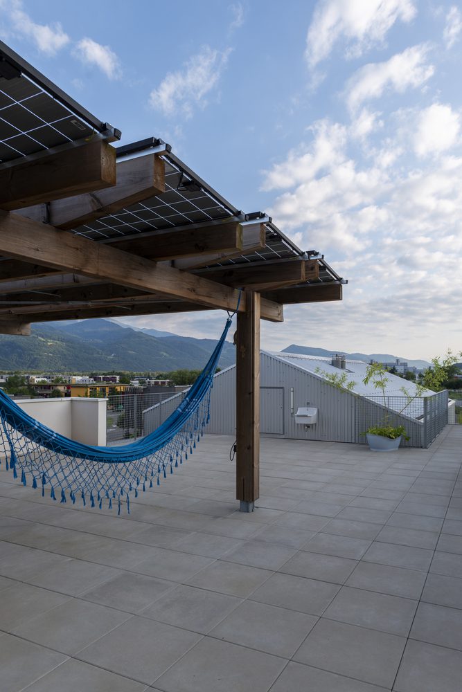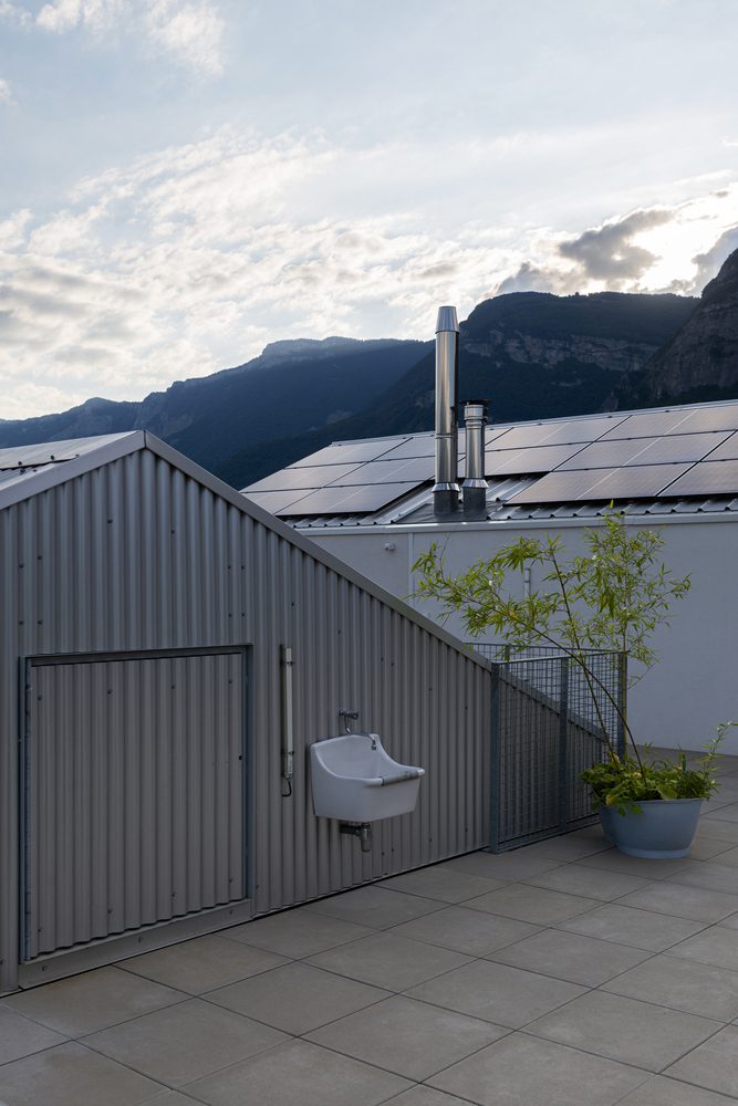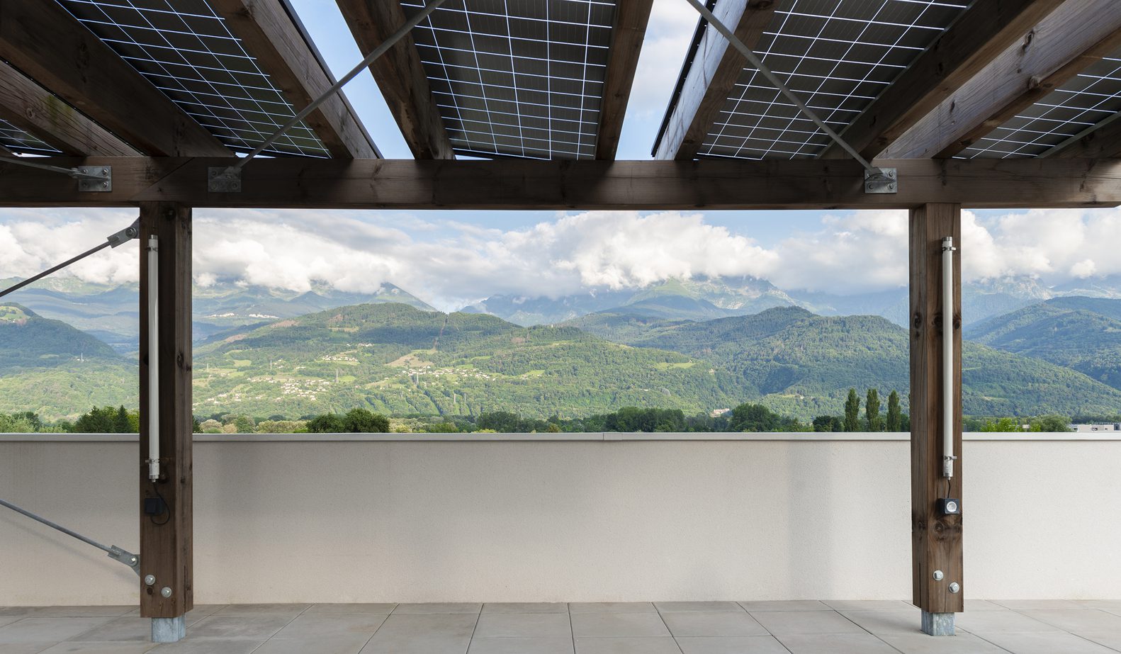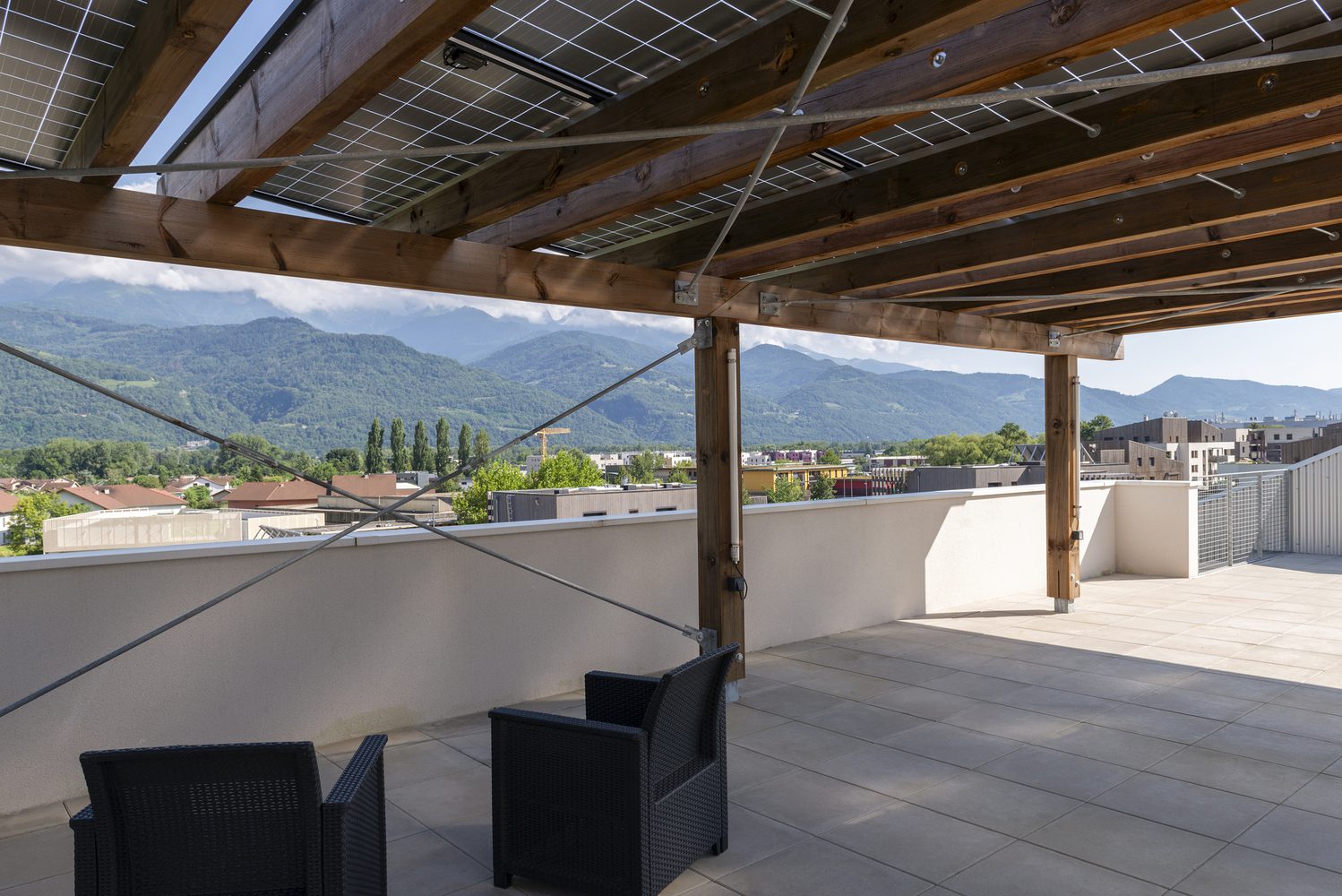Some partitions between apartments can be removed for greater future flexibility. A shared common space has been created on the ground floor of the building. It is equipped like a small apartment and can be used as a reception room, meeting room, or to accommodate family or friends. A panoramic rooftop terrace was designed for the residents. It is equipped with a photovoltaic pergola that produces electricity while cooling the building during the hot season.