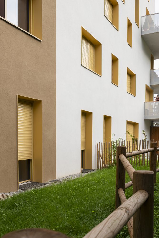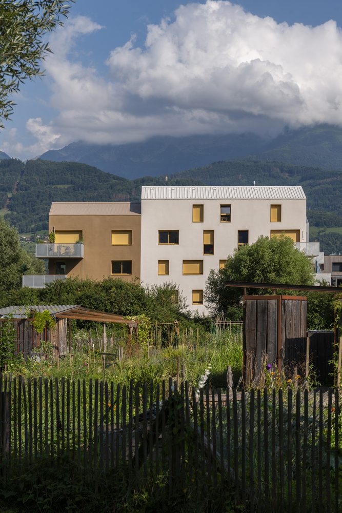 At the foot of the building, green spaces, including a large communal garden with fruit trees, a vegetable garden, and a compost bin, have been provided for residents. Each apartment has at least one bicycle storage room and outdoor wood-frame cellar, as well as outdoor parking.  Rainwater from the roofs is collected and used for watering.