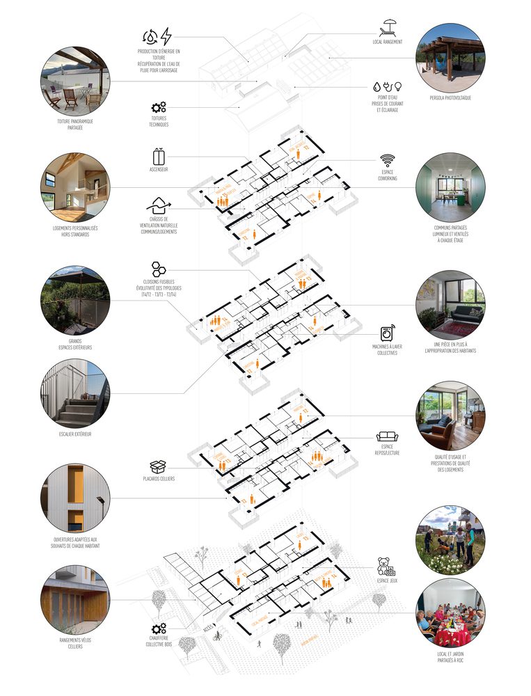 The project’s architecture is the result of a co-design process that was implemented with the future residents through thematic workshops. The building, constructed from a mix of materials (concrete, thermal brick,  wood, etc.) combines a certain compactness and adopts specific features from individual, intermediate, and collective housing. One of the building’s distinctive features is its large balconies at each corner, creating bi- and even tri-oriented housing units overlooking all the far-reaching views surrounding the site. Each unit has been individually customized with each resident, down to the size and variation of the facade openings, giving the project a unique and singular identity.
