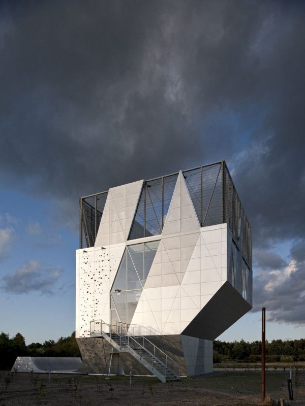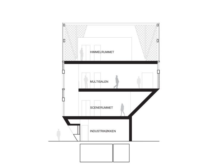 A skate board ramp climbs the wall on one side, mountaineering wall on the other and through a hatch in the wall the indoor kitchen is connected to an outdoor barbequing area and eating facilities.In summer time, the kitchen is the heart of outdoor events from summer festivals to Friday bars or spontaneous get-togethers. In the winter the kitchen could also be used as a satellite kitchen for private events in the settlement in addition to events in the building.The Performance Space on the first floor extends the building’s layout by adding a staircase for audience to the volume. The walls lean out and emphasize a stage floor measuring approximately 50 sqm.