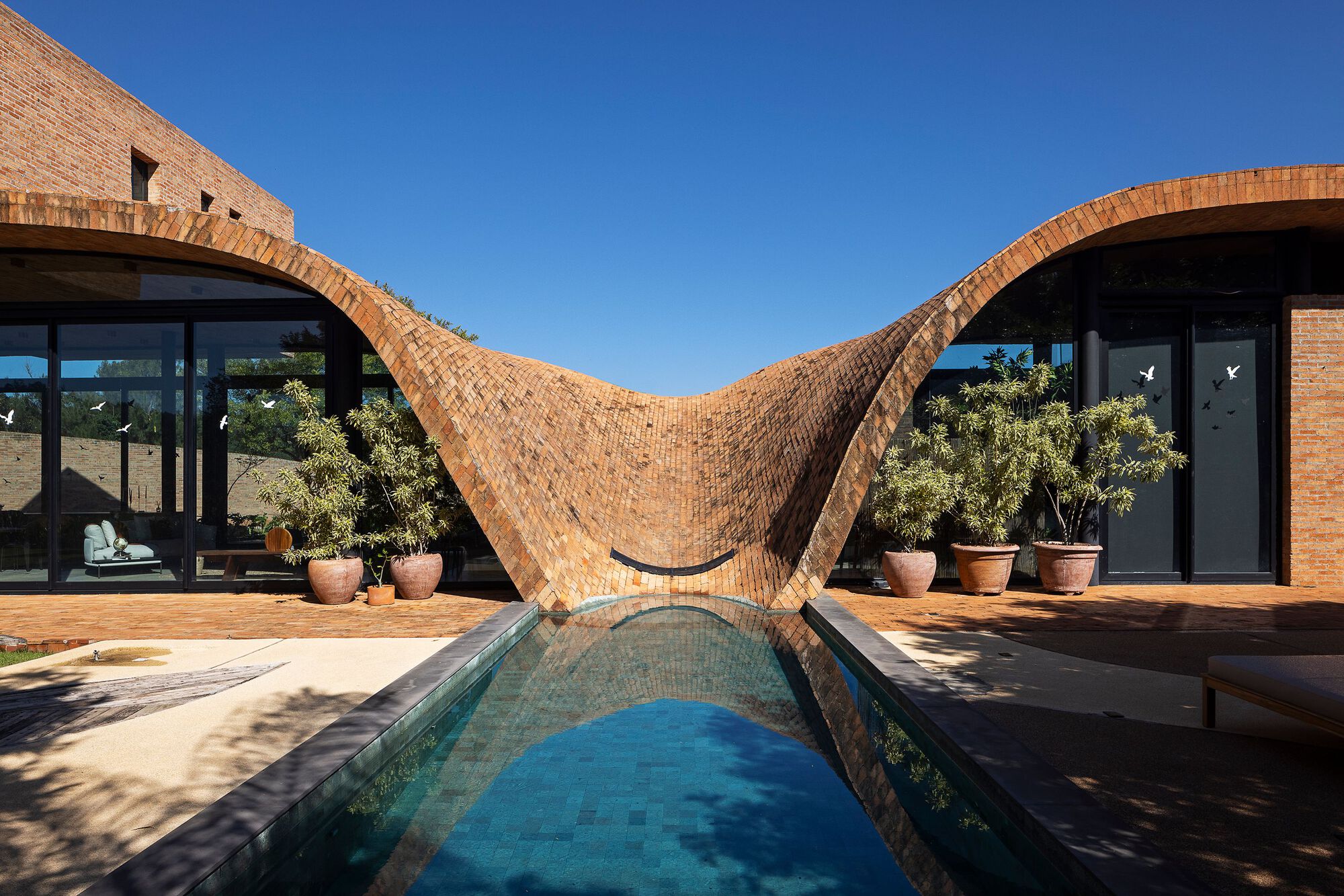 The exposed brick roof, with a pronounced curvature, is one of the central elements of the project. In addition to aesthetically marking the residence, it acts as a rainwater collector, directing it to the pool. The double slabs and generous eaves contribute to the passive cooling of the spaces, eliminating the need for air conditioning.