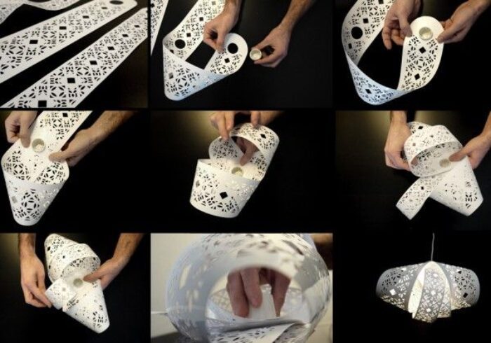 Cut & Paste features this patella to show off in Milan 2012. The lampshade has been created by translating some Arabian motifs into patterns, print it, cut it and then overlaying strips of this etched paper. When you see it from the outside it looks like a huge neutral white shad, the result is to create a soft lighting effect that emanates from the special texture obtained in the paper.