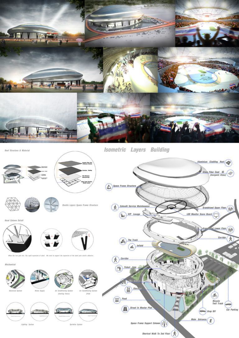 In designing have to use Unique of Cycling such as physical, cycling movement, cycling equipment for design architecture. I got an advising and helping from AVM. Thurdsak Sucharitham (Advisor) about design since Zoning design, Lay out design, Building form design, Structure and Mechanical. Have presented design develop successively and got guidance from Jury. The design can be quite detailed. Have more time to attentive important things as building structure and mechanical.