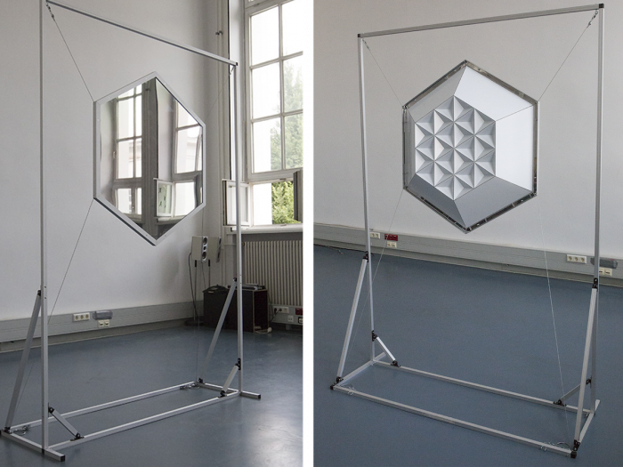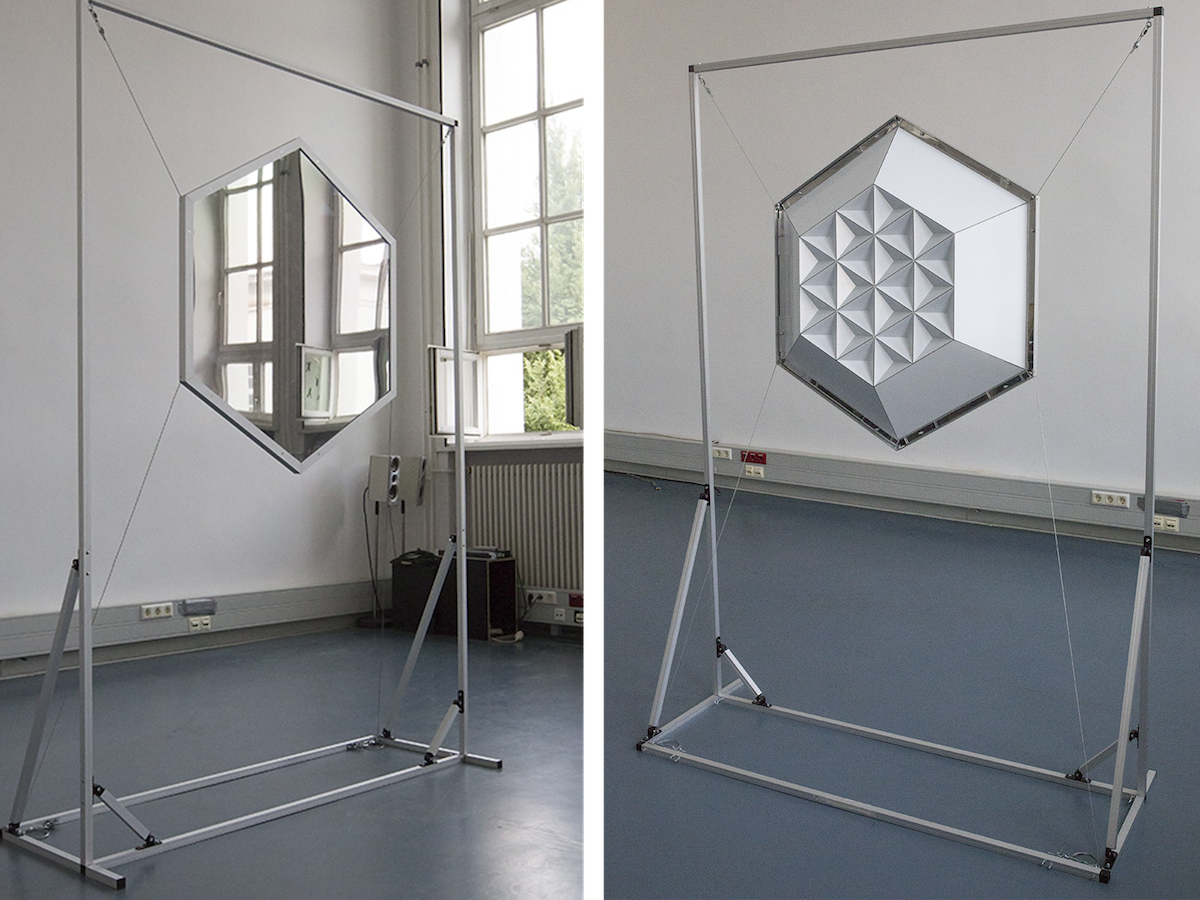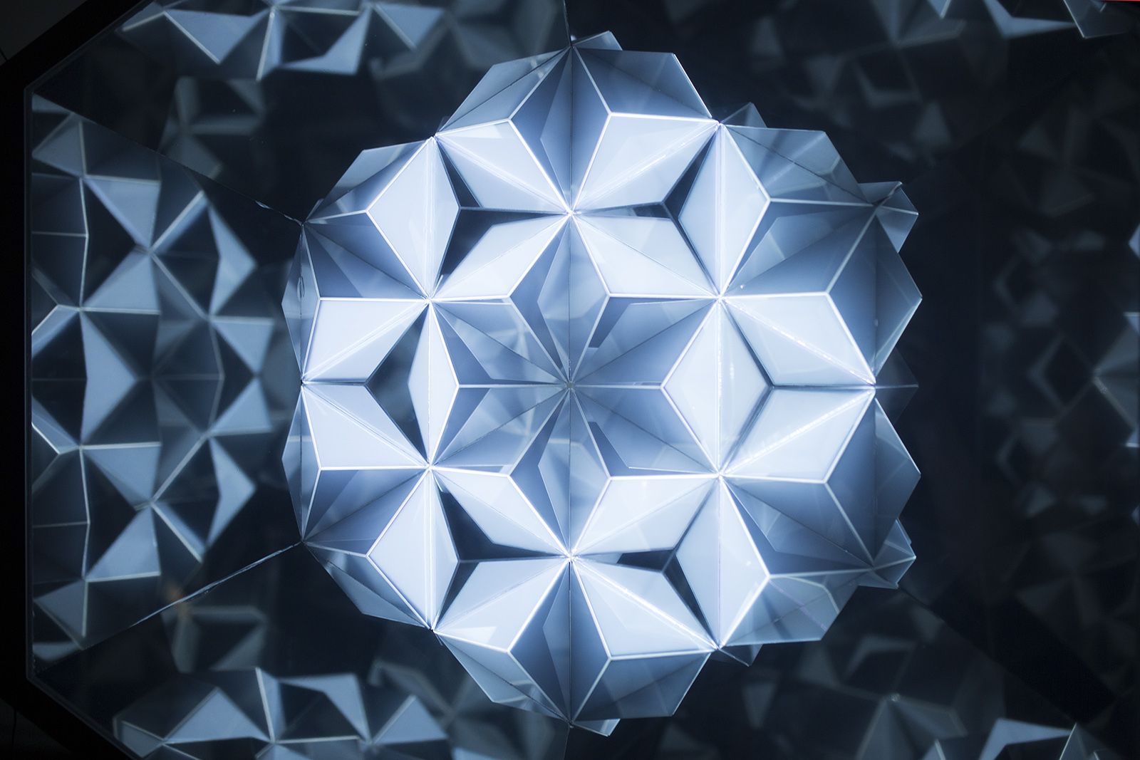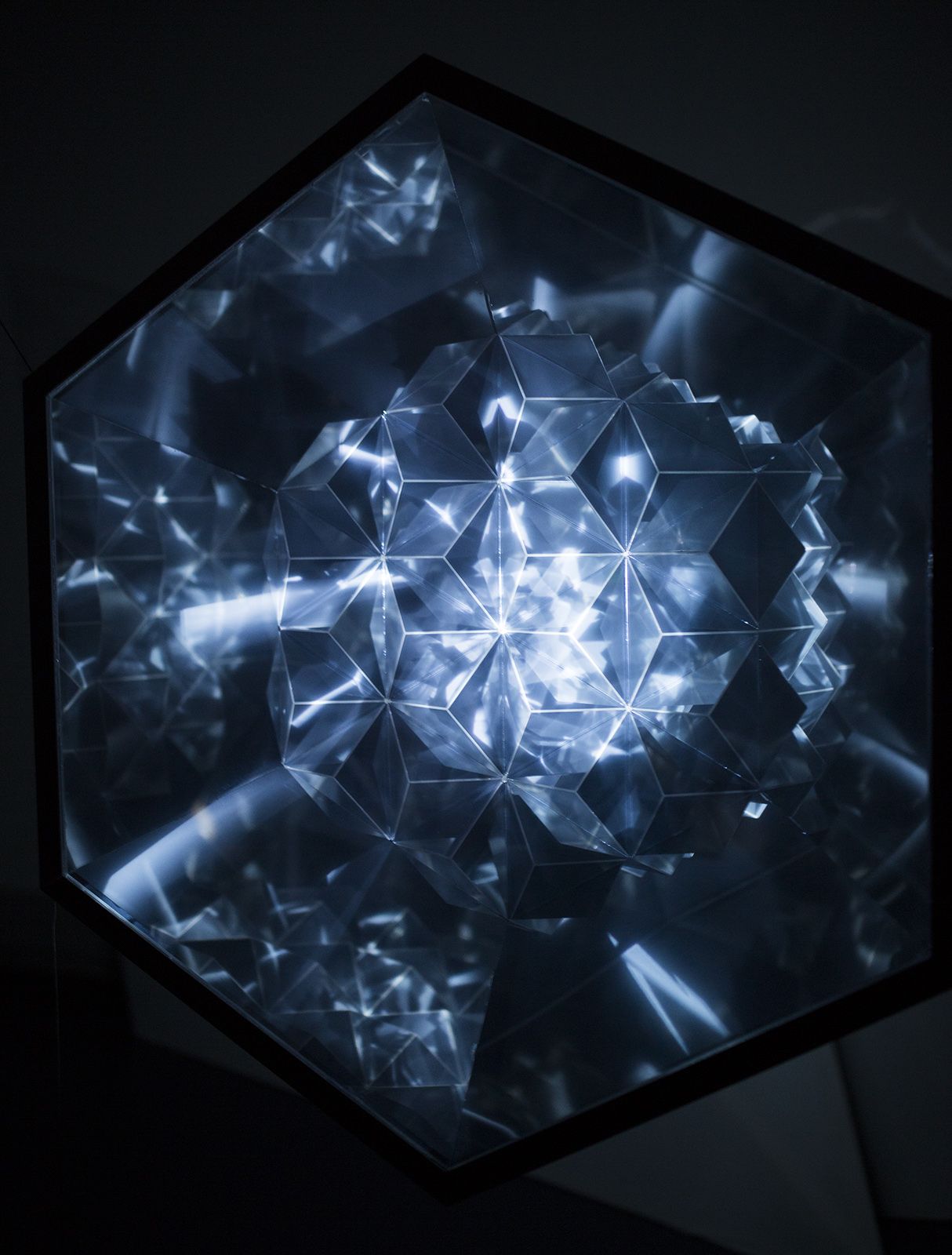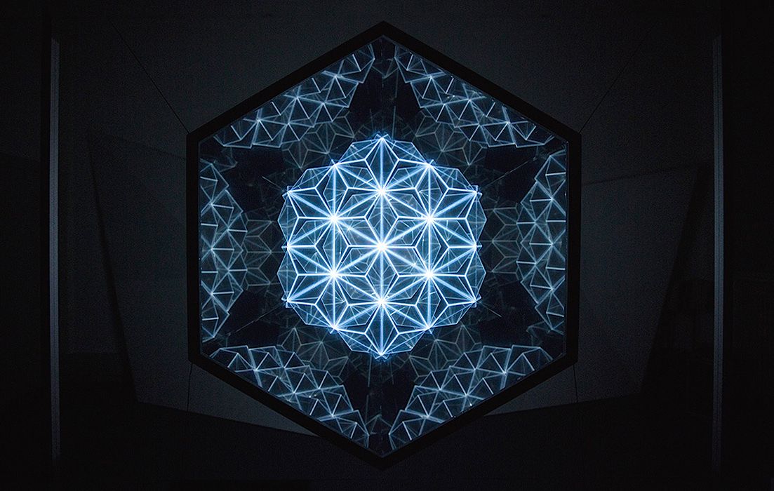 Inspired by the mysteries of quantum physics, and the simplicity of geometry, Gasper Battha has created a structure that leaves the human mind blown. The installation is created from reflections and projections of cubes, fractals of cubes, a rear-projection, two-way mirror foils, a hexagonal sculpture and animated graphics on the back of the structure.