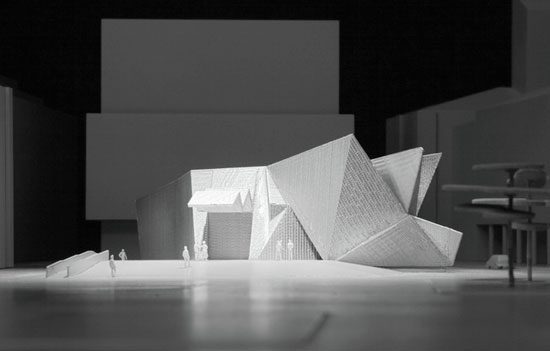 Hence how do we create the conditions for good acoustics despite a reduction of mass? Already the first considerations fixed in drawings show the basic concept of the Pavilion to introduce elements which are on the one hand the spatial transformation of sound sequences, and which on the other hand develop sound reflecting and absorbing properties through their pyramid-like shape: “Soundscaping”.
