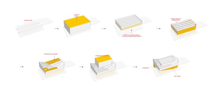 Based on the limited budget about 2.8 million USD for 3500sm size building; it was a big challenge to design the landmark in this region. The overall space requirement is separated into two major elements which are parking area, 900sm, and non-parking area, 2600sm. On one hand, the parking grid was mainly applied to limit the design for the utmost efficiency to maximize the space, and on the other hand, we had to interpret the church into another symbolic element to create the landmark in the town by differentiating the usual icon of church design in Korea, such as red bricks, symmetric plan, and the pointy roof and the cross at rooftop.