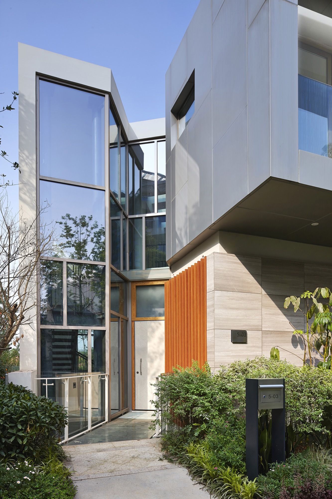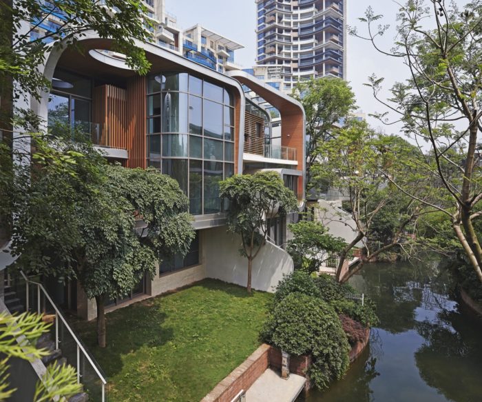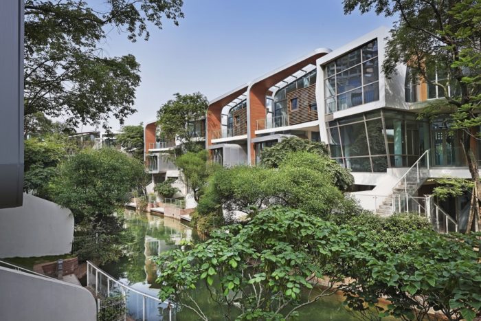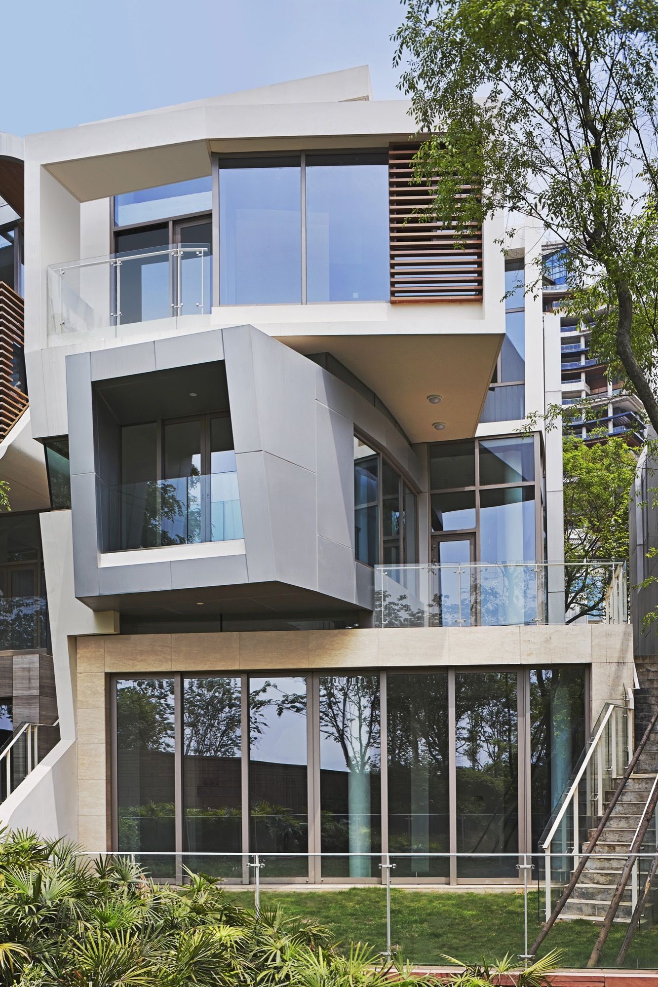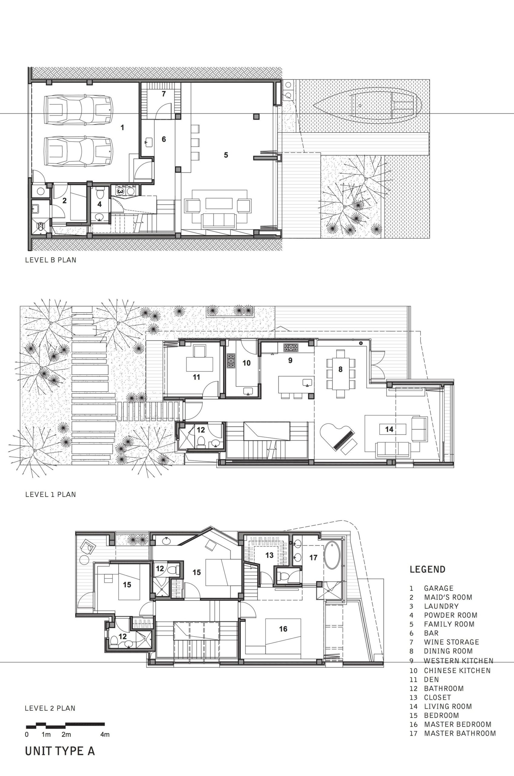 The upper levels are given over to private bedrooms, and the lower levels to additional recreational and communal spaces that open out to the lake or canal. The structural system for all villas is poured-in-place concrete, with various cladding materials that include hard-troweled plaster, wood, metal, stone, and glass.