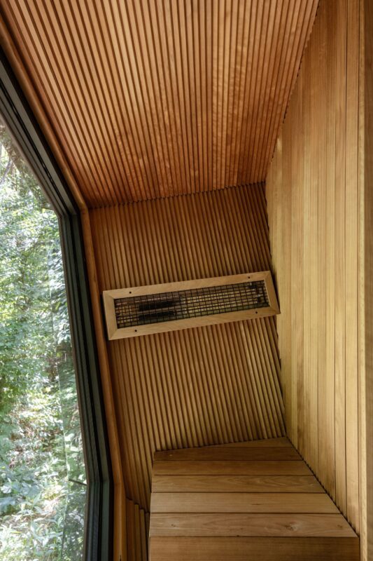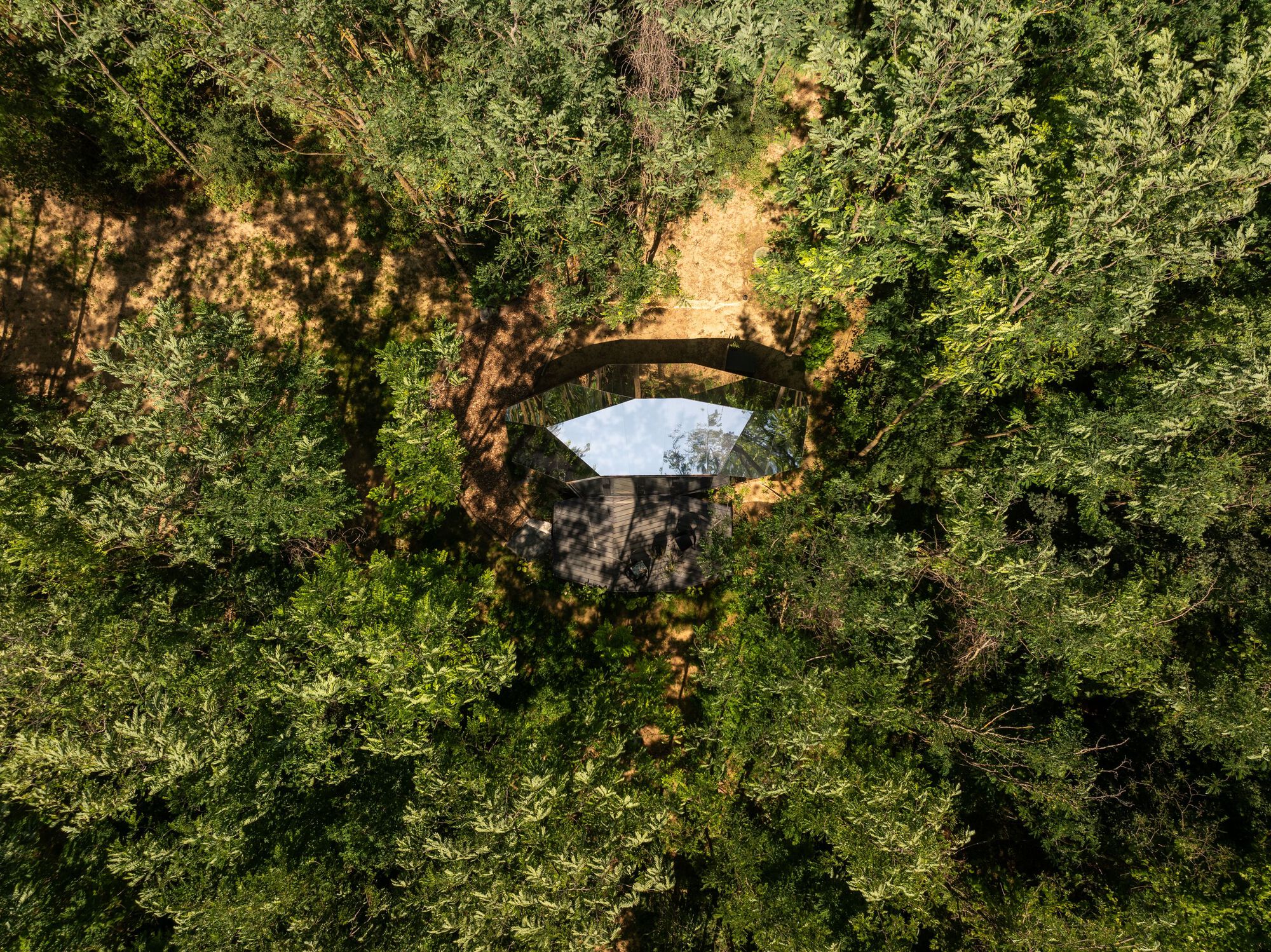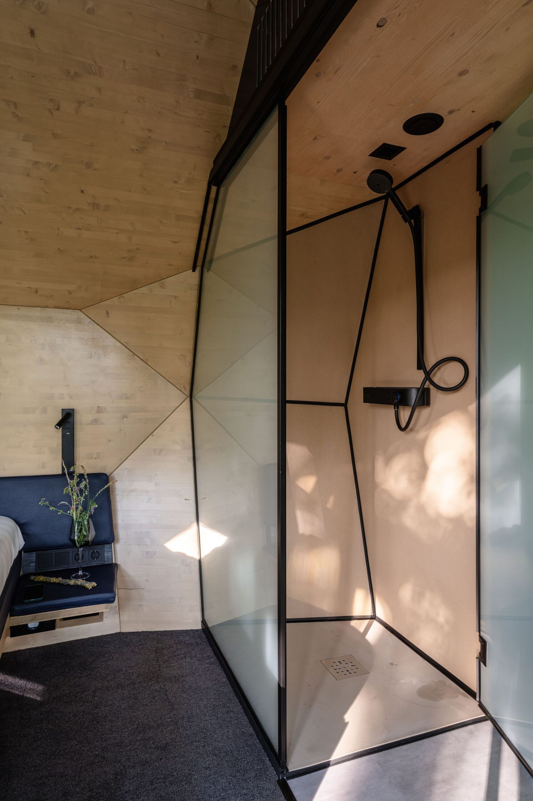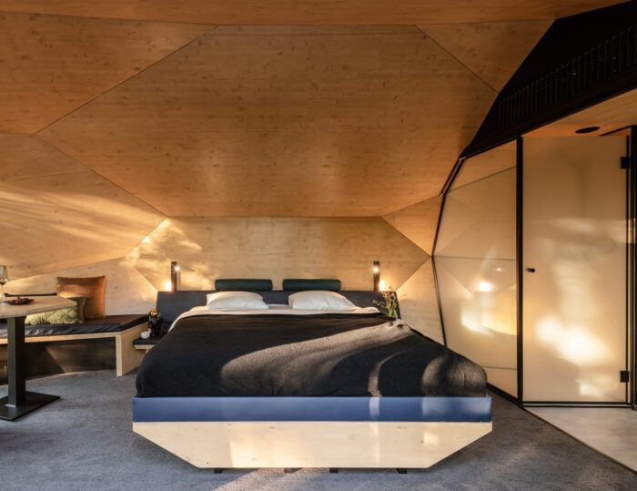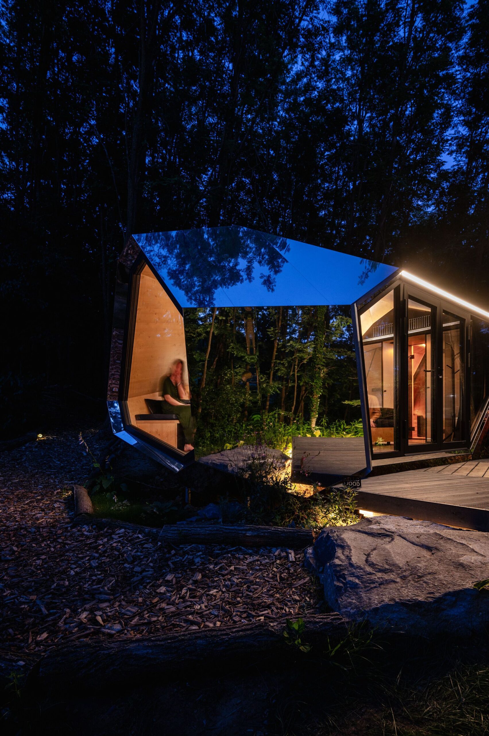 Behind the efficient and contemporary realization of this unique, sculptural structure stands Hello Wood’s proprietary construction system, submitted for patent protection. This CNC-manufactured three-dimensional shell structure combines a solid wood CLT (Cross-Laminated Timber) load-bearing core with insulating and waterproof layers. This innovation enables the creation of complex spatial forms and irregular geometries, while also reducing material waste and assembly time. The design is highly adaptable to various environments and client needs: depending on the material and texture of the maintenance-free exterior cladding – which may be wood, stone, aluminum, or even mirror – it can either blend into its surroundings, whether forested or industrial, or intentionally stand out from them.