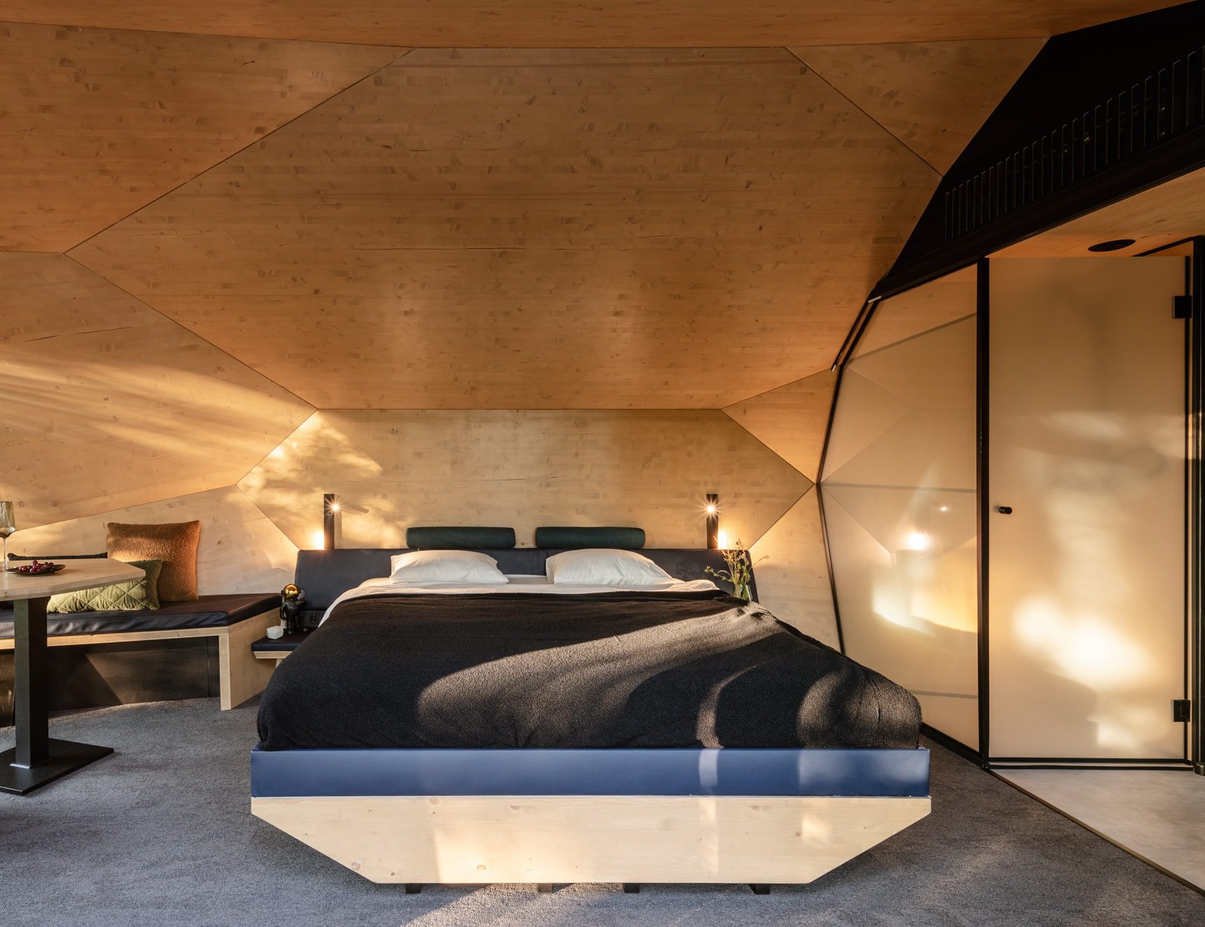 The cabins are fully customizable in functionality and materials, tailored to the specific needs of each client. Despite its compact size, it offers a complete user experience with the comfort and quality of a five-star, two-person hotel suite – including a king-size bed, dining area, kitchen, bathroom, panoramic infrared sauna, and large glass surfaces. Moreover, the cabin can be expanded with additional PEBL units, making its spatial layout highly flexible. These uniquely shaped, sculptural land art objects can be rotated and relocated, showing different faces from every angle – much like irregularly shaped pebbles. Their potential uses are nearly endless: they can serve as a festival resting area, meditation studio, creative workspace, exclusive guest room, or even a private sauna.