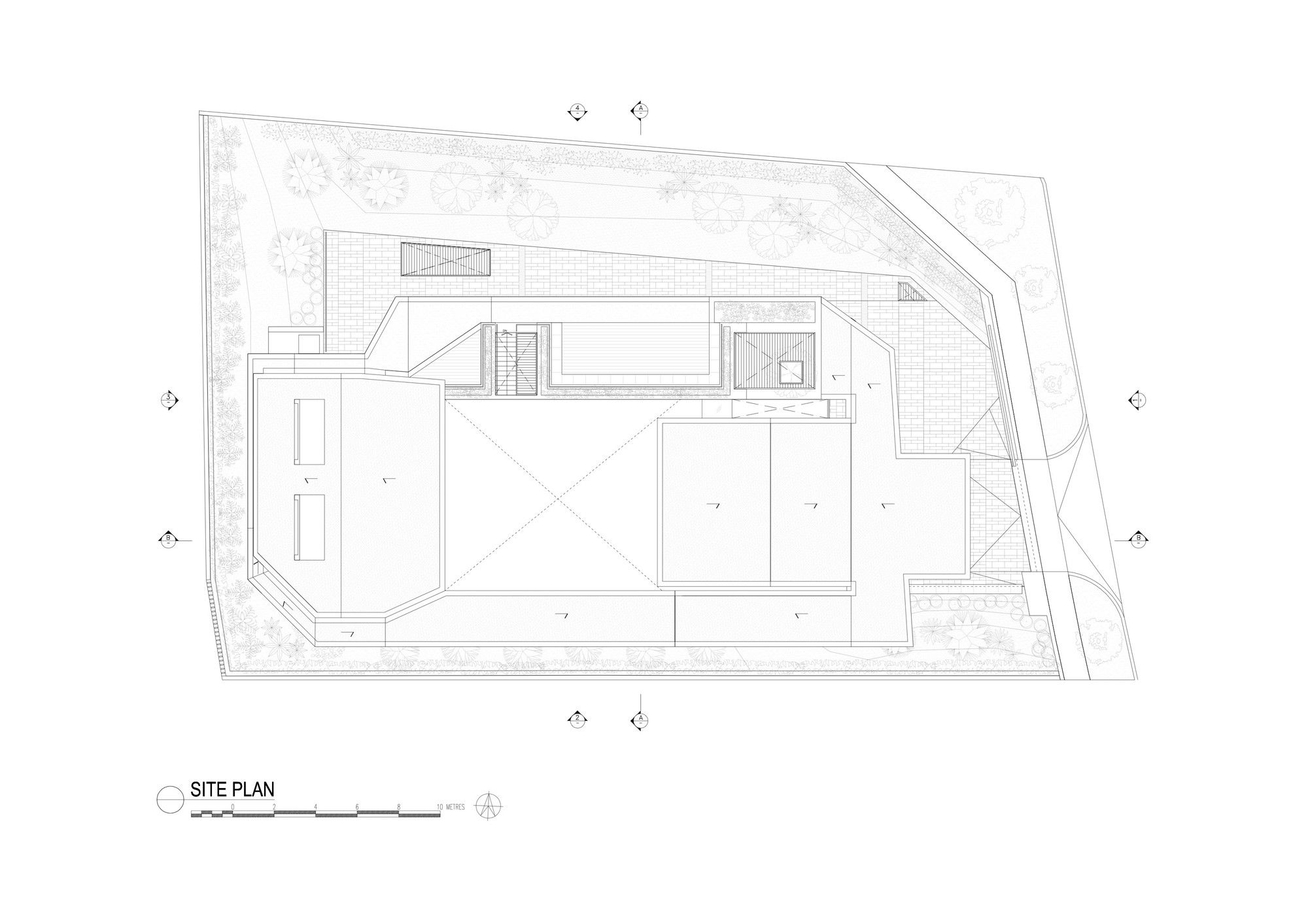 From the urban context, the design gives back to the street the landscape lost as a result of the development. The architect kept the built form low and ground-hugging by making the undulating turf-covered roof appear as a continuation of the landform. Understated from the outside, the internal spatial expression of this peeled-up roof creates the sensation of an enlarging and grand internal room that simultaneously leads the eyes upward to the sky, as well as downward to the intimate central gardens below. In another move to shield the house from surrounding noise, the architect encircled the main spaces with the circulation.