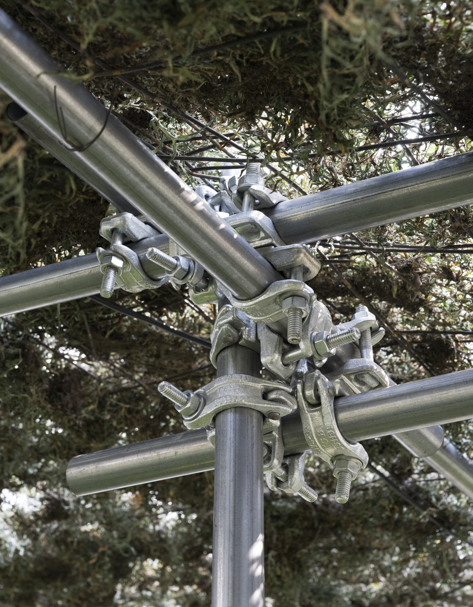 The roof area of the pavilion is experimented with a ‘patch’ of grass, the same type as the original lawn in this site, providing a natural quality that allows sunlight to filter through. It creates shade similar to the tree canopy. Dried and decomposed grass increases gaps that willingly allow sunlight and artificial lighting to pass through, varying throughout the day and during the event time. From the entrance of the venue, the roof will introduce itself as an elevated ground and gradually shift to forming a roof definition when you walk closer to the pavilion. The lightweight systematic structures are constructed as lightweight parameters, defining sets of proxemic zones. Additionally, free-form circular seatings are specifically formed by different sizes and distances in various locations. These positive and negative spaces are incorporated to enable the situation of gathering or dispersal for diverse groups of people based on the size and type of activities.