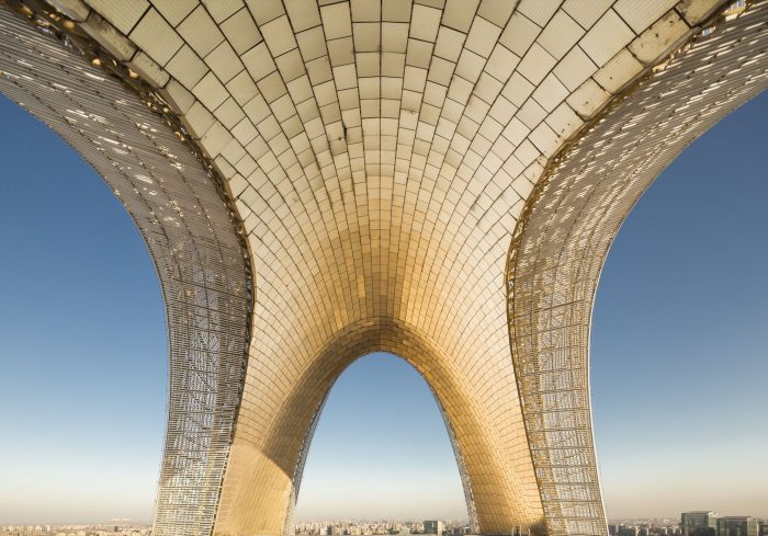 For the 3D round shapes, it is hard to find the way to make them perfect by normal materials, such as metal panels, or glasses. We use glazed terracotta (Chinese traditional materials, such as2500 years-old terracotta warriors in Xian Qin’s Emperor Mausoleum and Chinese traditional glazed roof tiles, last for thousand years but never decay for its strength and bright color. These short terracotta baguettes with different lengths and cutting angle of end surfaces weaved to fulfill the sensitive 3D curved shape.