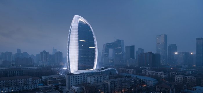 The form of the High-rise building comes from Chinese character “人” which translated into English means PEOPLE, corresponding to the title of the media PEOPLE’S DAILY. The triangular plan is transformed from the structure of the character “人”. And the streamlined body is shaped by cutting an ellipsoid with three hyperboloids.