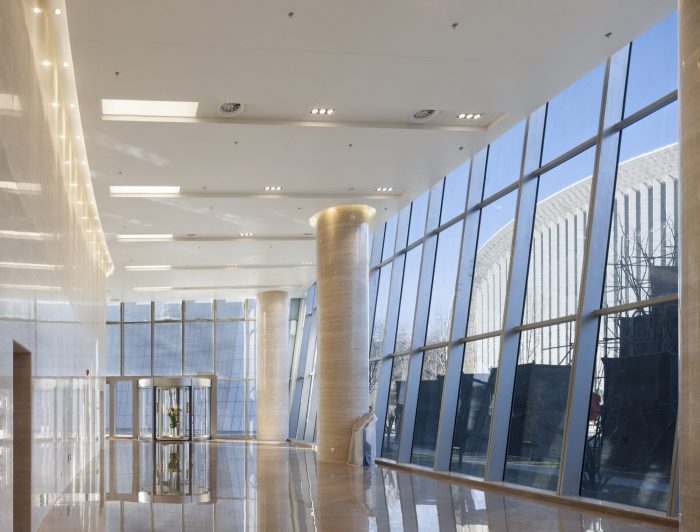This building has been one of the most important constructions in Beijing since 2008 Olympic Game. Two reasons for this, one is that People’s Daily is the top official newspaper in china, and two due to its hot location in the heart of Beijing’s CBD (commercial business center), about 8 kilometer east of the Forbidden City (ancient emperor palace, the symbol and core area of ancient China’s capital), where there have been a few of internationally designed architectural works. We won the national competition in 2009 and began to construct in 2010, finished in 2015. We try to do something which will be a creative, contemporary and modern, but also reflect our culture and tradition. More important, this building has to be cost-constrains, use effective and environment-friendly. As the whole design contracts, we finished the all design works, including architecture, engineering, landscape, and interior.