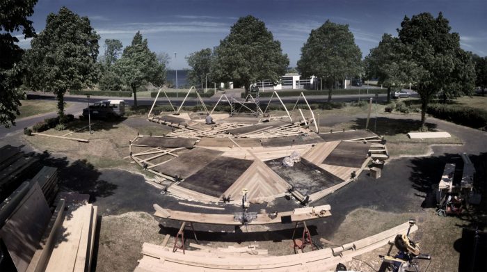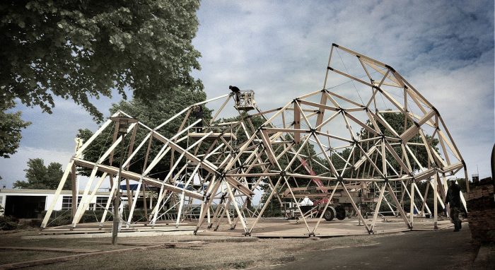 The manufacturing process was pretty intense. After the 3d modelling, the team printed nods through laser cutting and robot welding, creating a system of nodes in steel, which were interconnected through wood. After that, the team created a “skeleton” to cover as a tent, but designed a system that enables the skeleton to vary – it can be disassembled and readapted to new parameters.