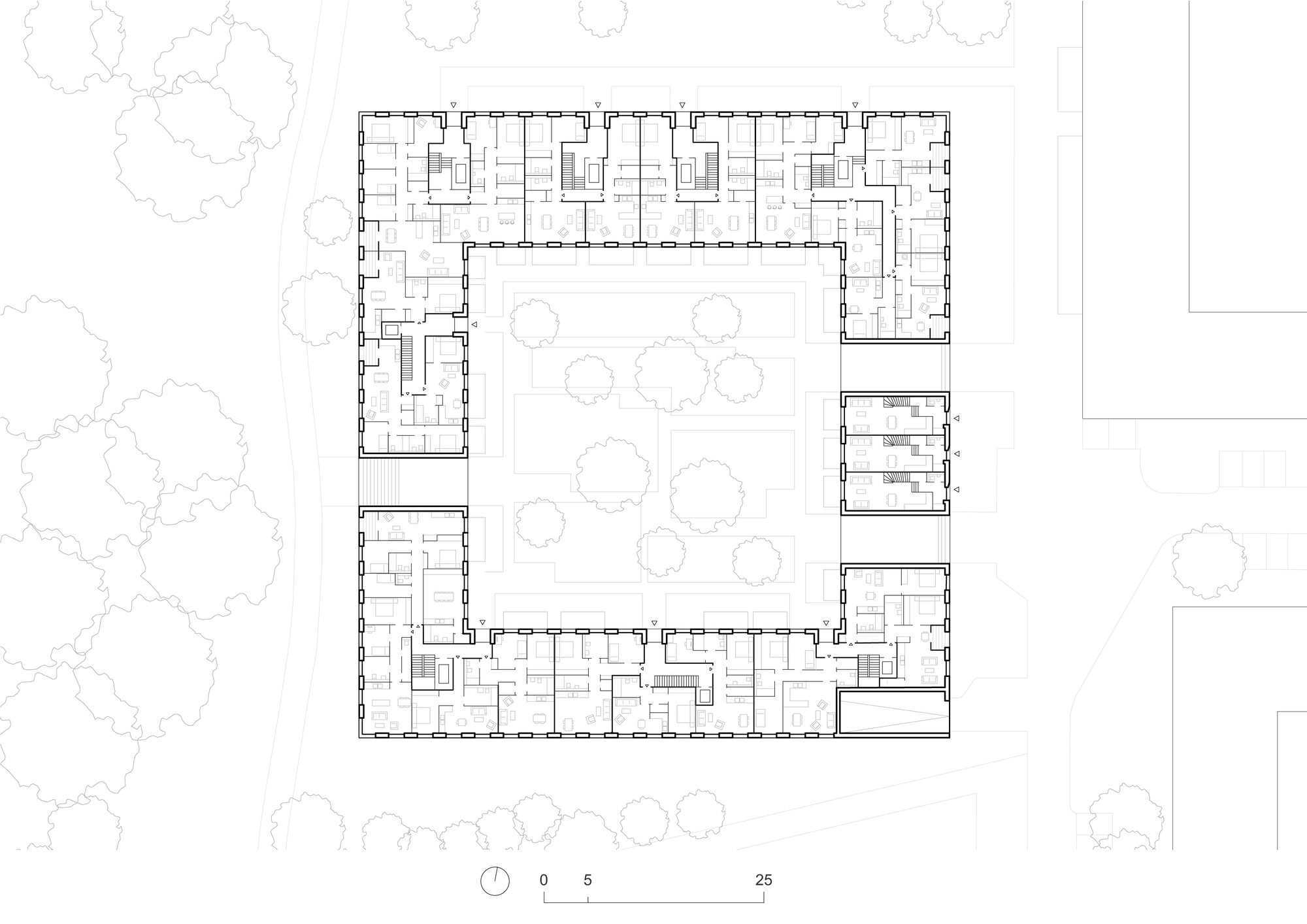The access to the apartments is almost exclusively through the communally used inner courtyard. The former use as an allotment garden settlement is reflected here in a patchwork based on the design grid. The differentiated design of the areas reflects a variety of functions. The majority of the residential units form interspersed living spaces. Residents have the opportunity to face the greenery outside on the one hand, and to participate in the life of the courtyard on the other.