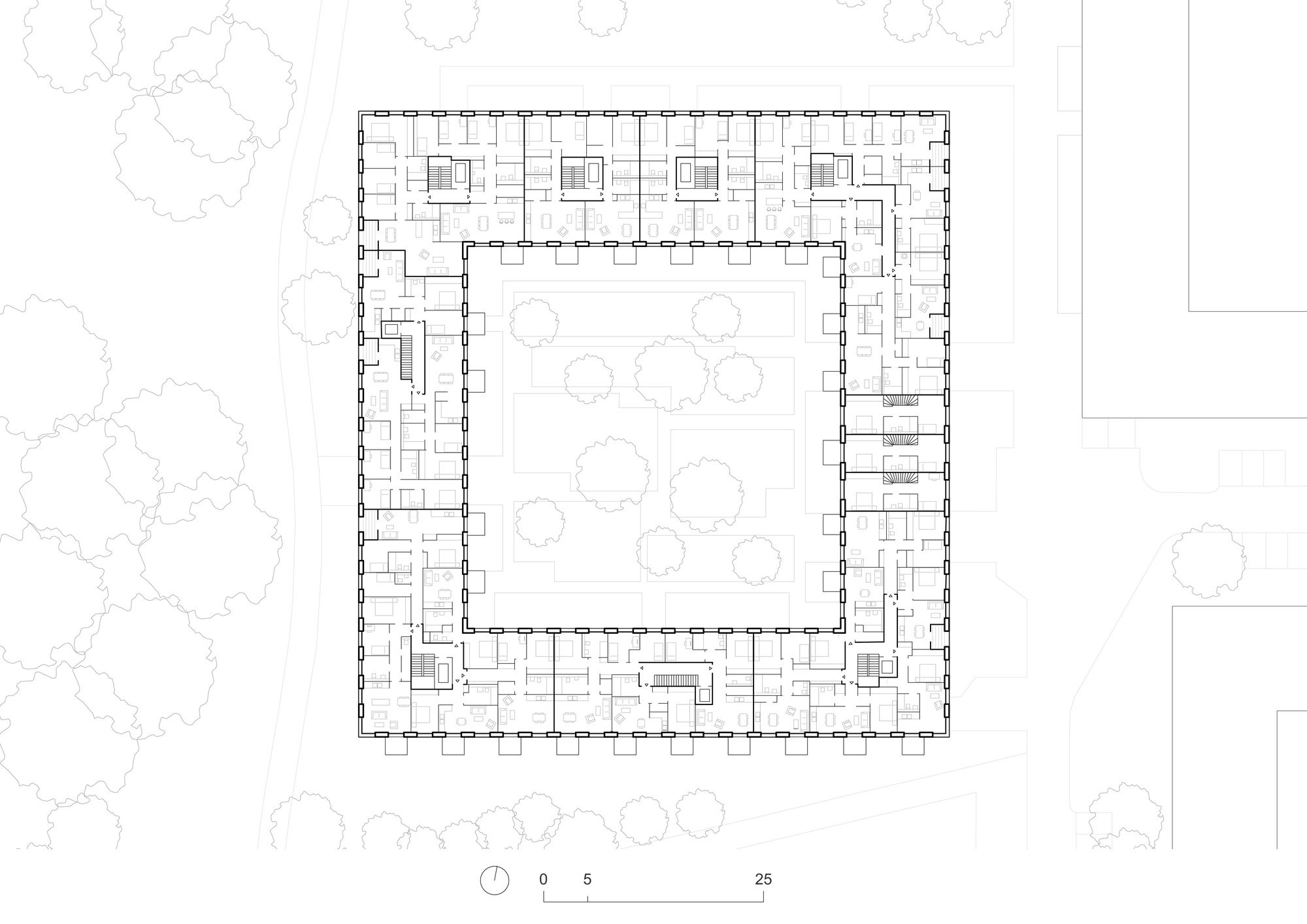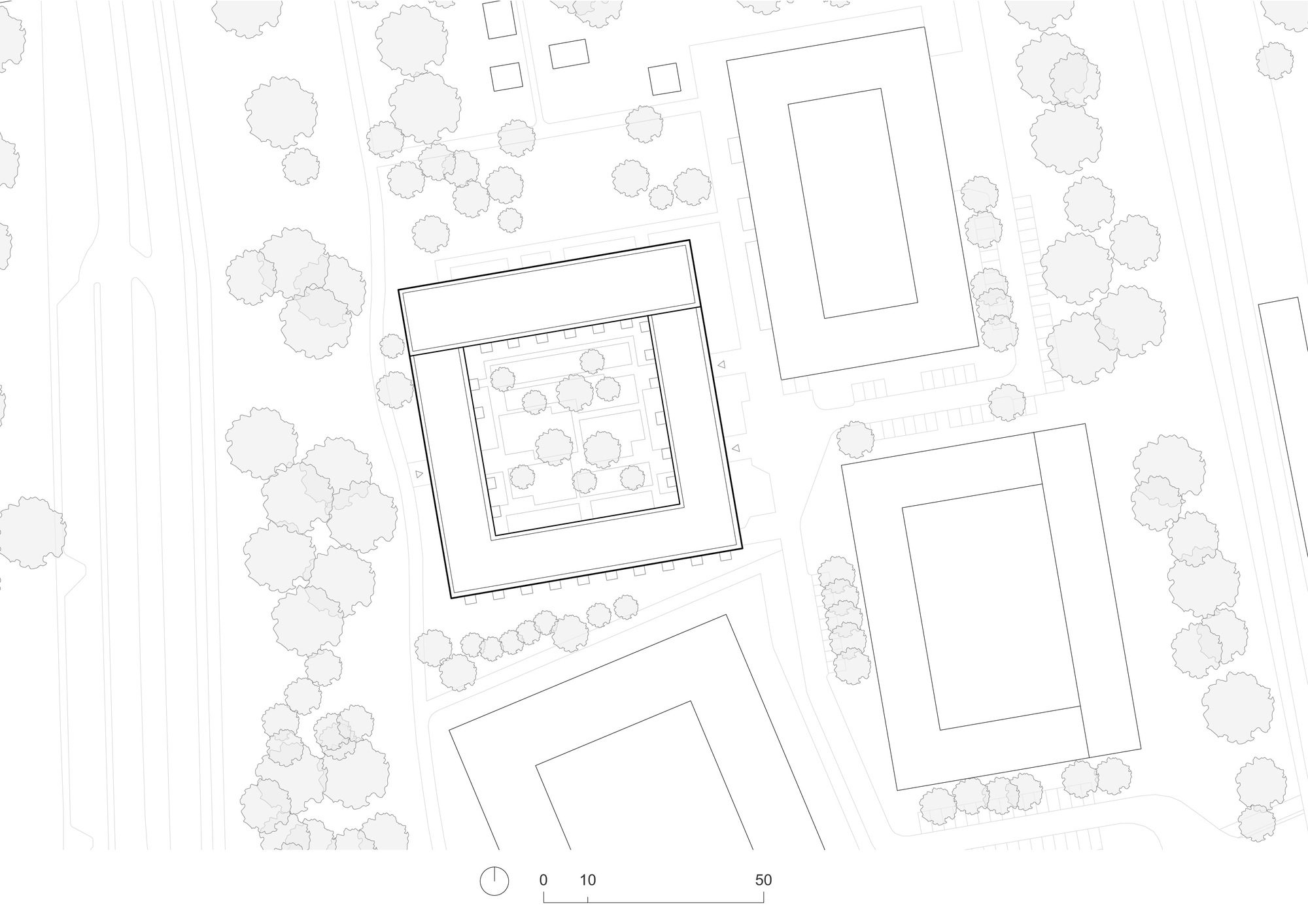 Architecture. The design is based on a clear grid, which is reflected both in the external facade design and in the internal structure of the building. The urban planning principle becomes a cross-scale design theme here and even finds its visual implementation in the interior spatial effect. The geometry of the building is clearly defined. The side lengths are identical, while the building sections on the east, south, and west sides are limited to 3 and on the north side to 6 full stories formulating a conclusion.