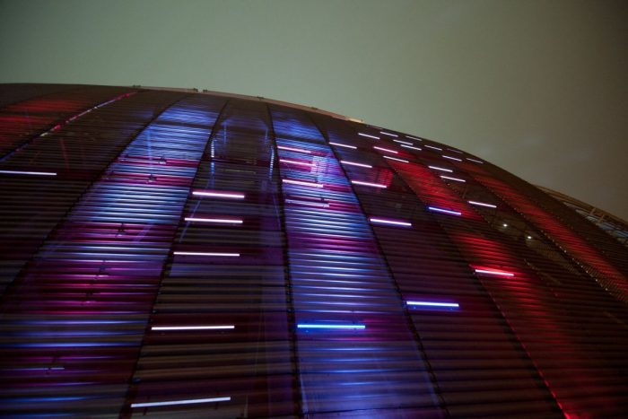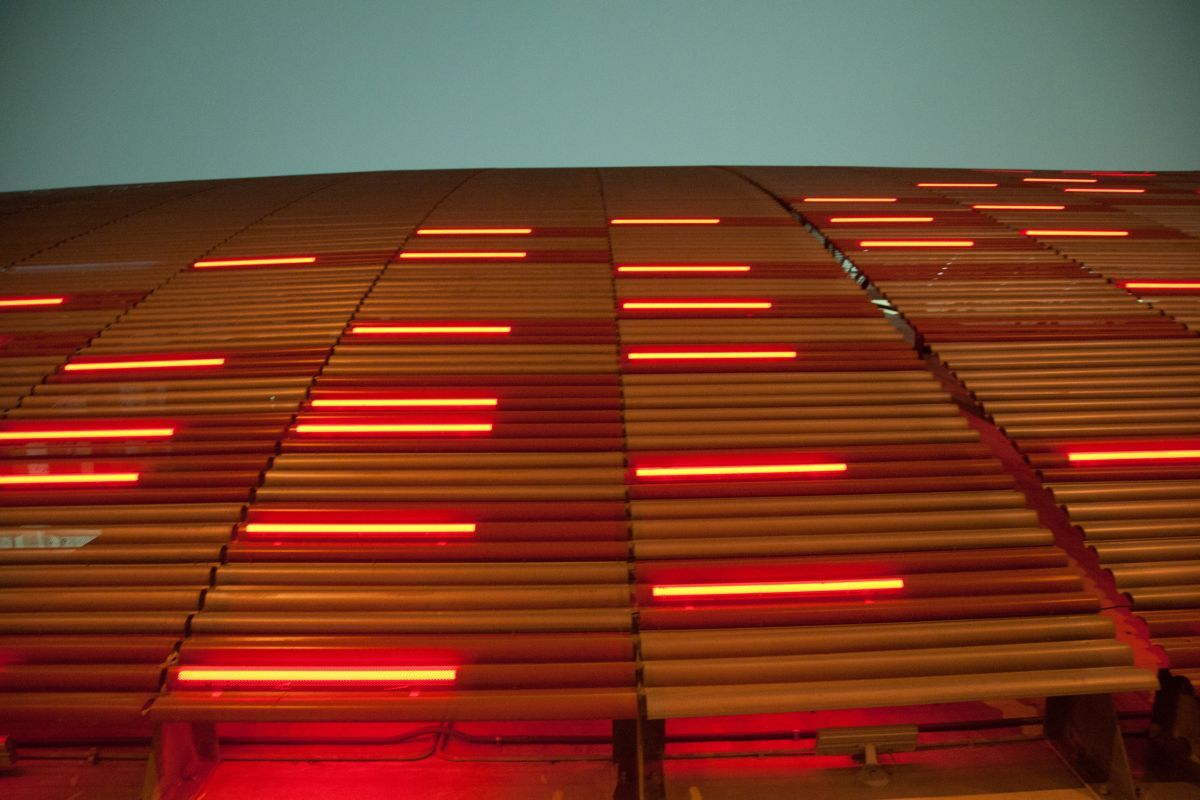 The lights themselves were designed to integrate seamlessly into the architecture framework, laid out in dramatic flames that wrap upwards around the structure. As the energy in the stadium goes up and down, the lights resemble volume bars rising and falling in time with the action. With the pattern of light constantly changing, varying in color, brightness, scale, and speed, the façade is appears to be in motion making it just as entertaining to watch as the game itself.