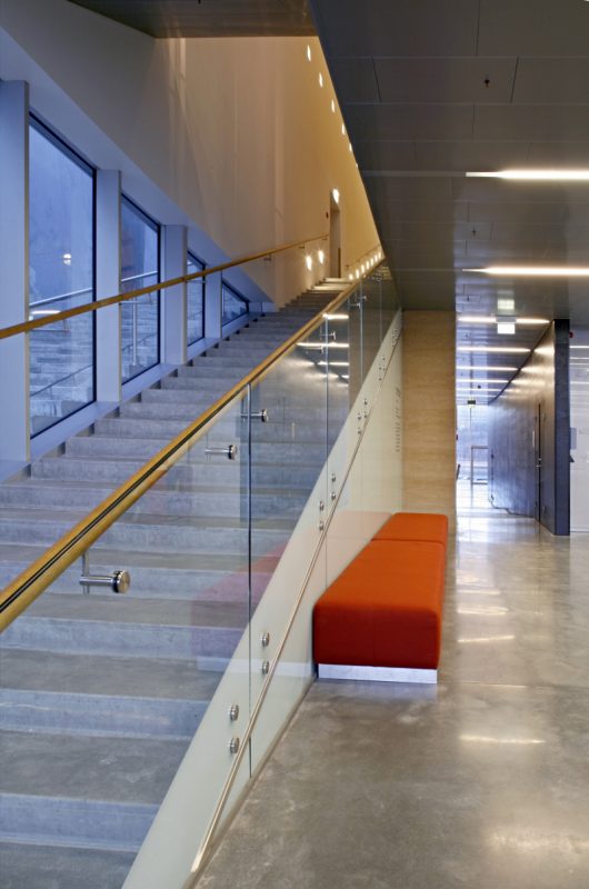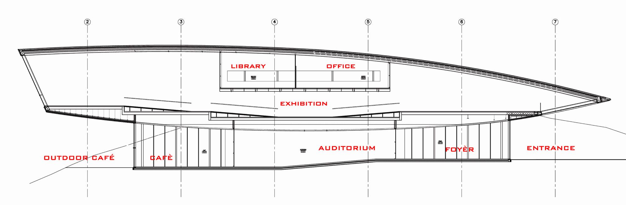 Snøhetta’s main purpose was to merge the building with the historical and cultural landscape by letting the roof section relate to the section of the land. The new 1350 square meter museum building is transparent at ground level, to highlight the relationship between the landscape and building, while the first floor exhibition spaces are enclosed in an organic cocoon. The stairs leading up to the exhibition areas run alongside a glass wall, in parallel to the granite face outside.