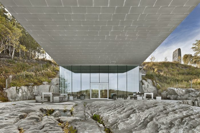 Two 70-meter long wire-cut rock walls, 15.5 meters apart, define the site. Between these walls, a new ground level and landscape is established. The museum itself is 11.5 meters wide creating a 2-meter clearance to the rock wall on ether side. This open space reveals a new sightline and allows the visitors to circulate between the building and the rock walls“, describes Snøhetta.