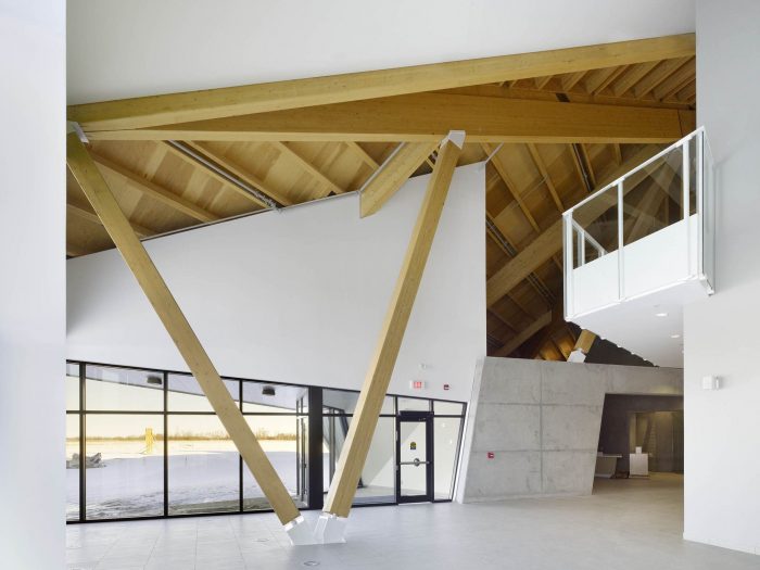 The natural surroundings of Wembley are maintained in the Museum through sustainable design, including a sophisticated cistern system collects rainwater and redistributes it to irrigate the surrounding landscape. Massive structural members were created with Canadian Pine-beetle wood; i.e. trees infested with pine-beetles that were rendered useless went through treatment to become salvaged. A high-performance envelope was detailed with triple-glazed windows (to reduce heat loss) and zinc cladding (to endure the harsh climate). Mechanical systems provide air supply below the concrete floor of the Museum to efficiently create the precise temperature and humidity required for a state-of-the-art museum and research environment.