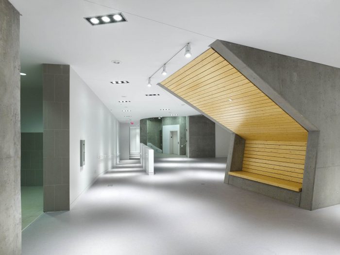 The form and spaces of the building choreograph and reflect this narrative, and suggest the shape of the ad-hoc structures that protect archeological fieldwork. Above ground, primary interior materials reflect things that grow on earth, while concrete on the lower, below grade level evokes the weight of earth and buried fossils. Visitors physically descend in parallel with the timeline, moving further back each time they round a sharp corner. At every opportunity, displays open out onto the paleontology labs through glass floors and windows, putting the important work of the facility on display.