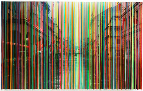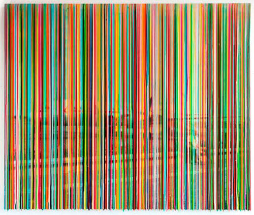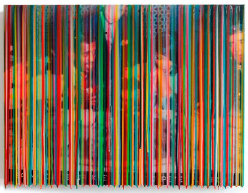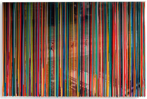 Photo Drips, I believe Markus Linnenbrink’s work explains itself as he explores color and texture in his artwork. The background consists of a photograph that peeks through the paint lines covering it revealing certain areas and hiding others allowing the mind to piece together the image.