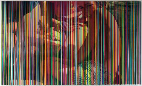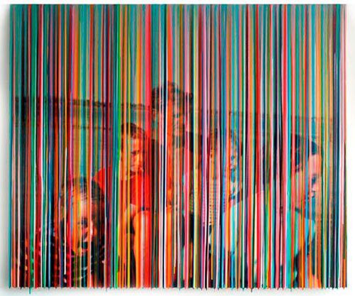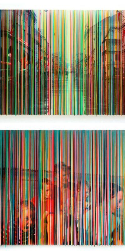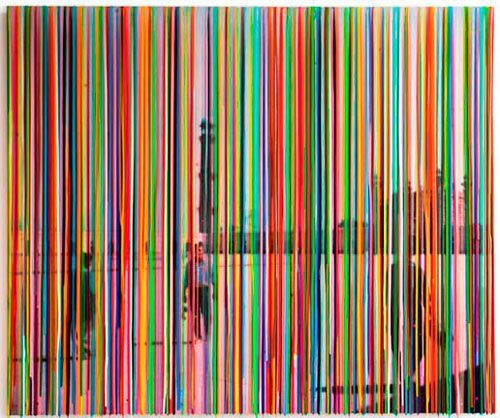 Photo Drips, I believe Markus Linnenbrink’s work explains itself as he explores color and texture in his artwork. The background consists of a photograph that peeks through the paint lines covering it revealing certain areas and hiding others allowing the mind to piece together the image.
