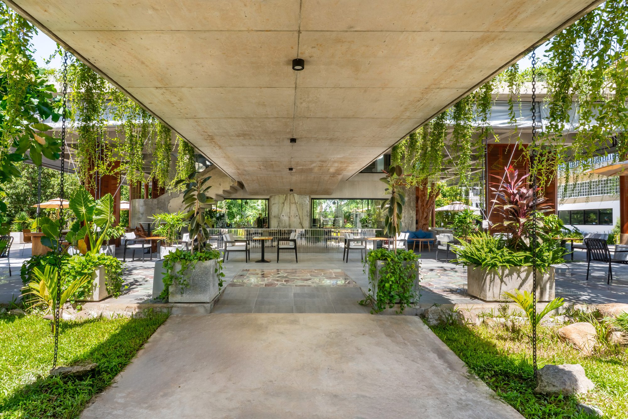 One of the most striking interventions is the use of greenery as a design material. Cascading vines and climbing plants are woven into the architectural composition, hanging from slab edges and wrapping around structural elements. These plants act as living filters, cooling the air, casting dynamic shadows, and blurring the boundaries between built and natural environments. The building becomes a frame for nature rather than a container resisting it.
