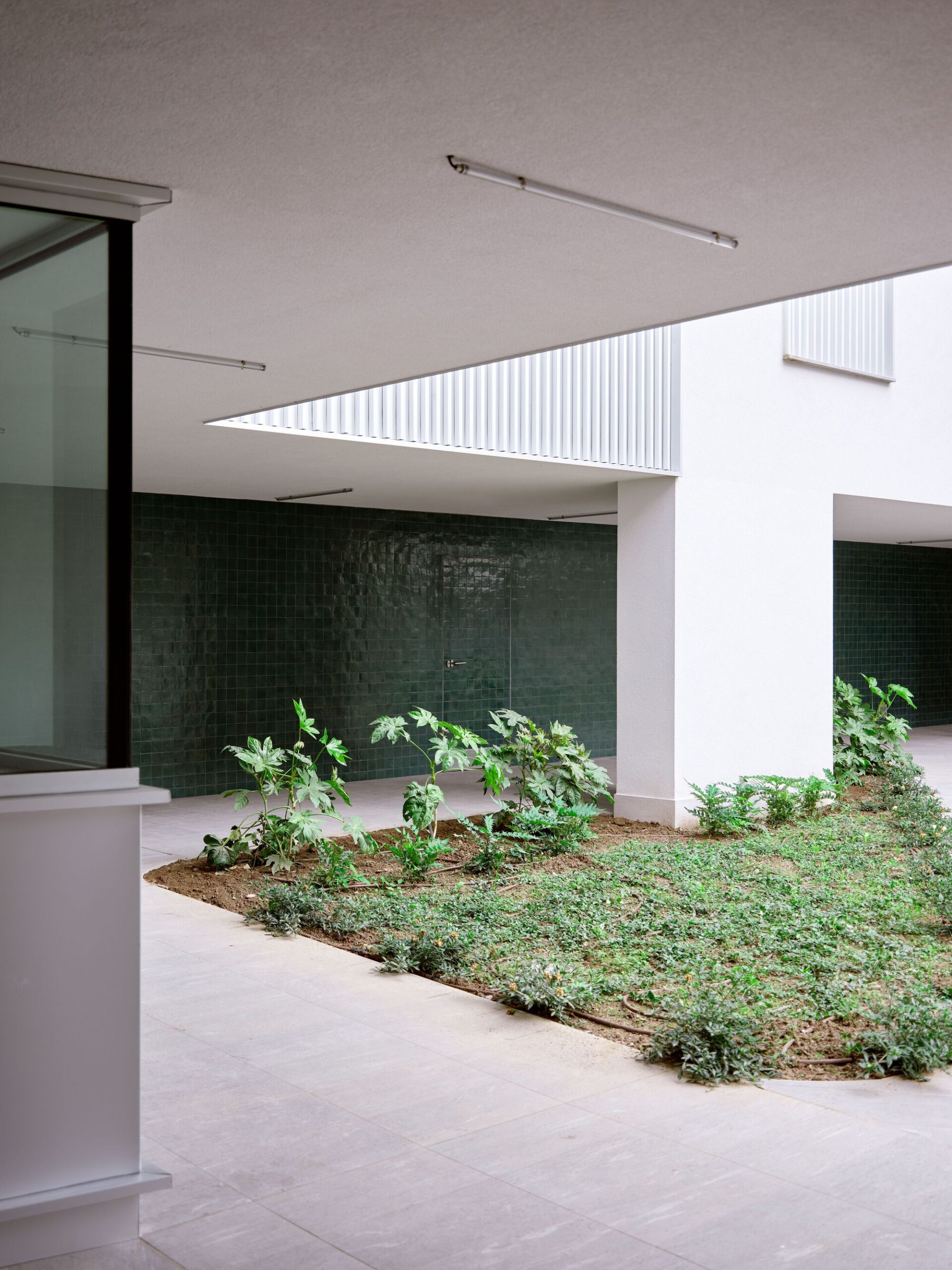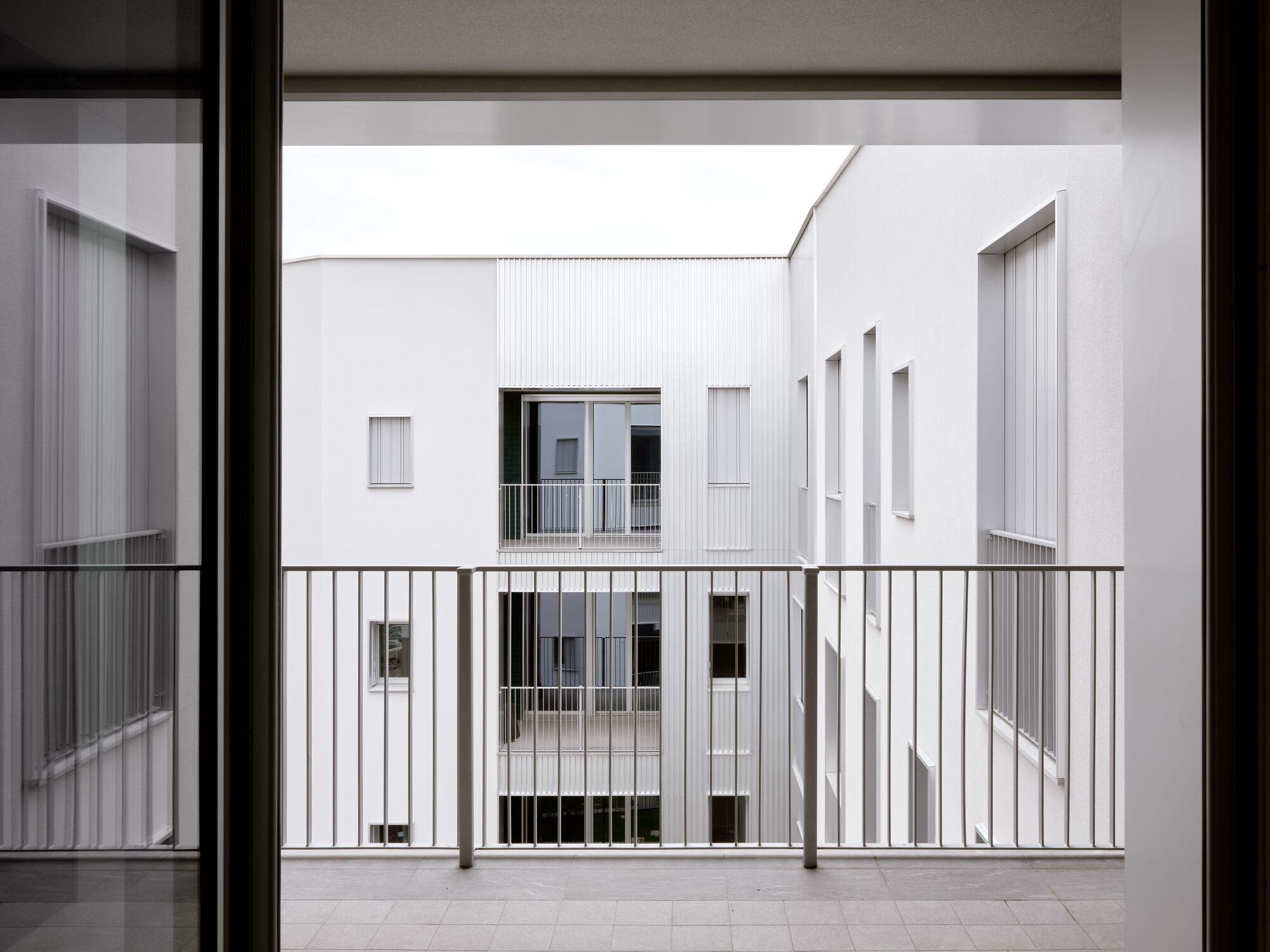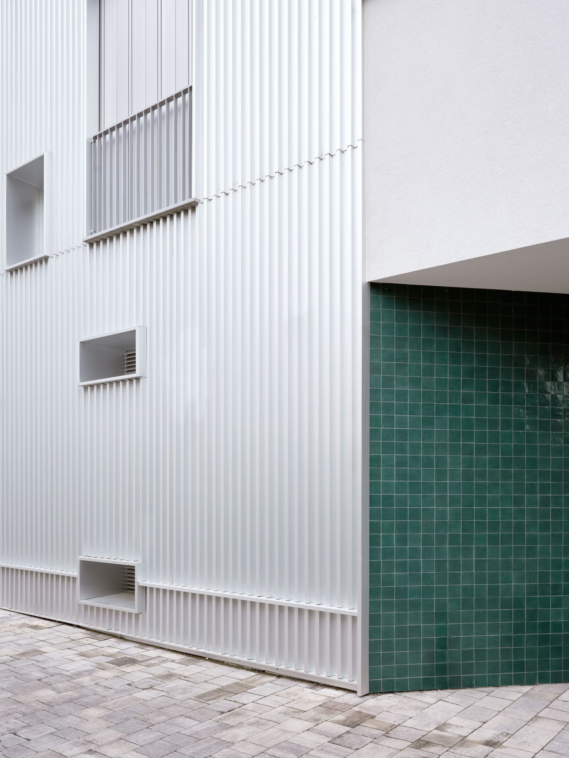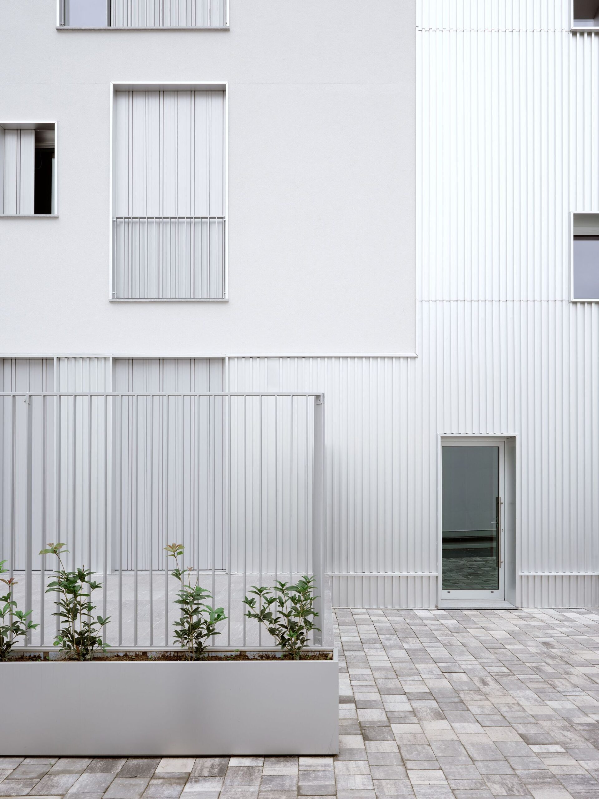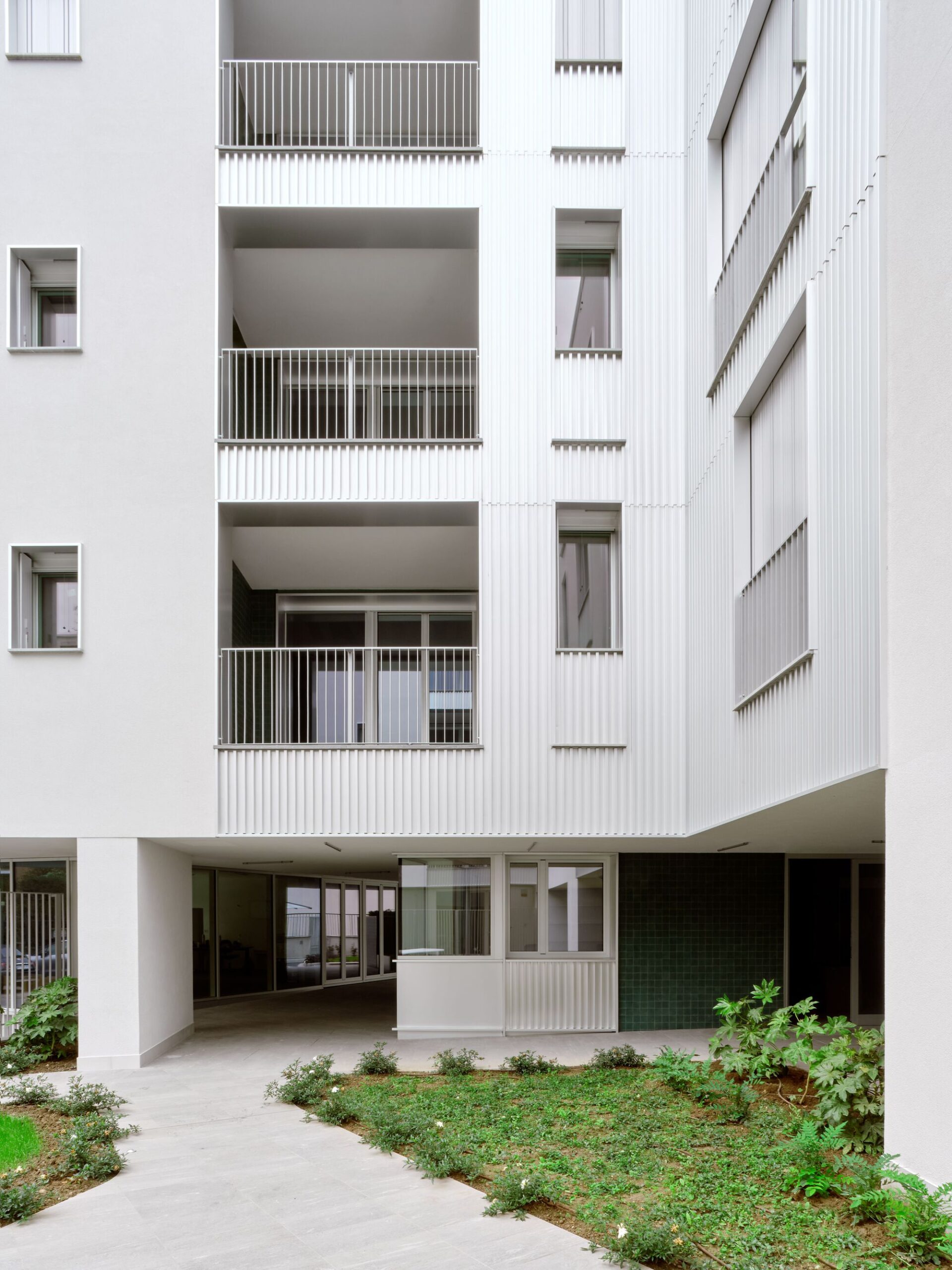 The façades generate simple geometric volumes, the loggias having been hollowed out to create a discontinuous yet harmonious pattern of solids and void, openings, and blind walls. Clinker was used to line the loggias as a tribute to a type of coating that has been widely used for the facades of Milanese architecture since the 1940s. Set back from the white facades, the aqua green of the loggias’ back walls is the building’s only note of color, in tune with the green of the internal courtyard’s vegetation.