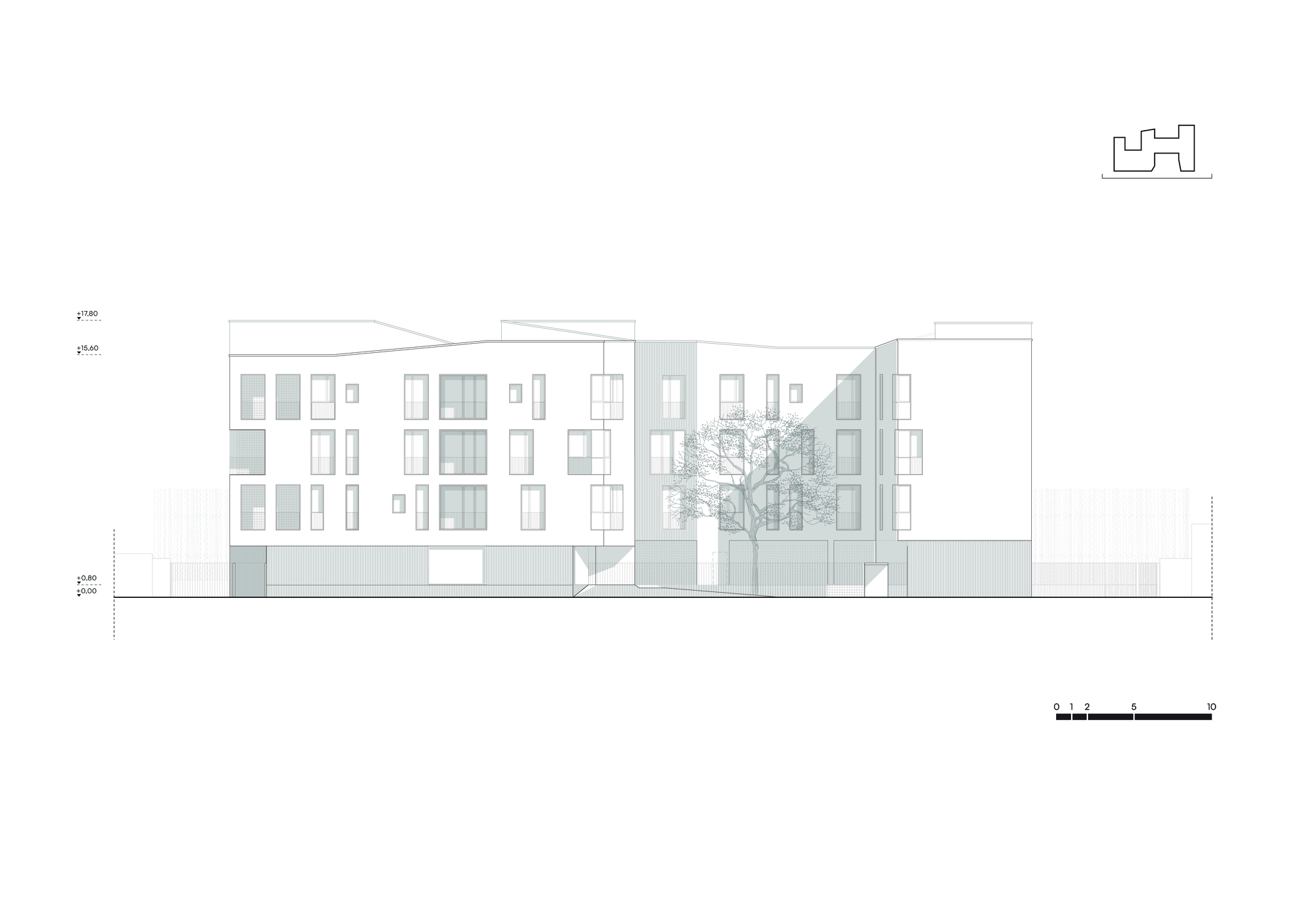 The project’s beating heart is the green courtyard open to the street; at its center a maple tree which, once grown, will make the view of the garden and the road from the windows and loggias even more pleasant. The courtyard, a reference to the urban courtyard that in historic Milanese residences is traditionally internal and private, opens up to public life. It acts as a filter between individual home living and communal urban coexistence.