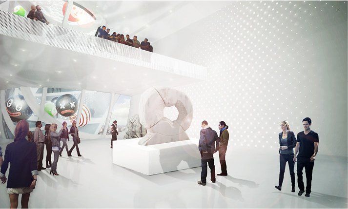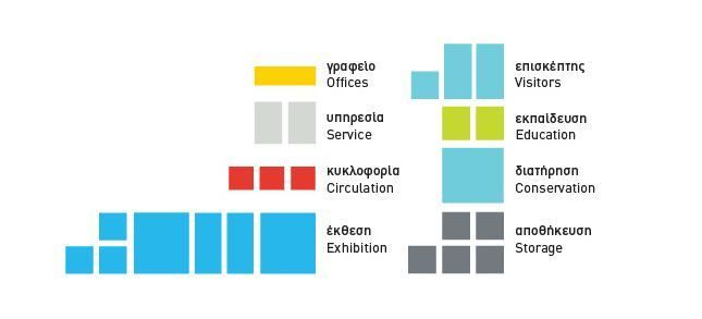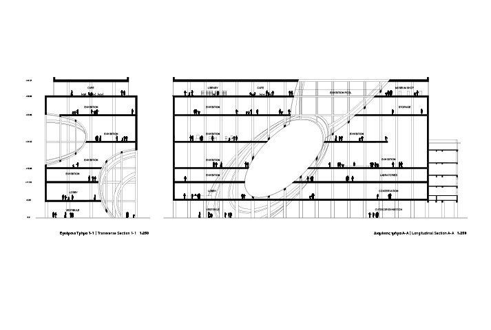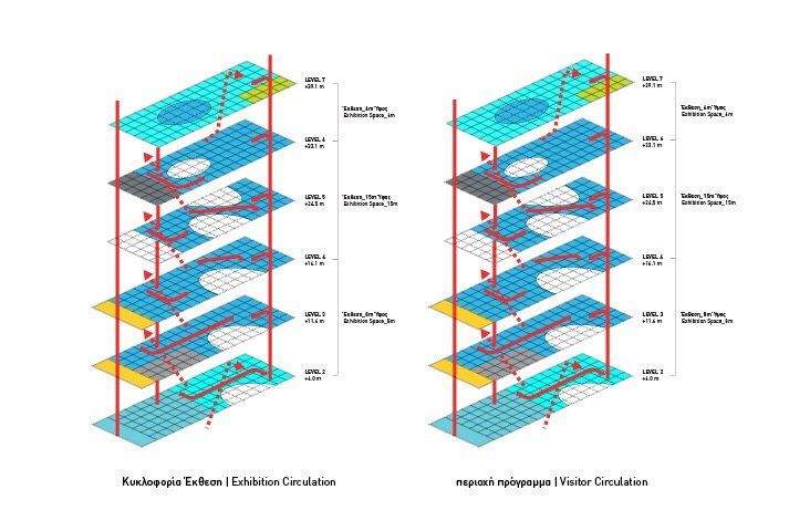 The museum’s exhibitions are combined in a continuous loop which spirals from the lobby to the upper level public space. This organization provides many possibilities for different exhibition spaces and techniques. interior/ exterior, covered/ open, dark/ light, intimate/ public. The large public voids enable antiquities to be viewed from differing vantage points stimulating visitor interaction. The museum program is concentrated in three program blocks: exhibitions, curation and administration. The programs are linked by three interconnected atriums which shape the museum’s public space whilst opening the building to it’s surroundings. Monumental vertical circulation is integrated into the existing structural grid along the east elevation. Multiple circulation cores provide shortcuts for visitors to jump off the linear exhibition narrative to direct points of interest.