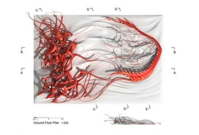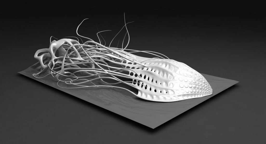 We parametrically created two shapes in this project, the first shape with a surface articulation progressing from bumps to tentacles in a dynamic, soft and gradual way. Then, this shape is affected by another rhizomatic one, creating a relation of tension between those two shapes and the ground, between the tentacles and the existing surroundings, and generally between the tentacles themselves.