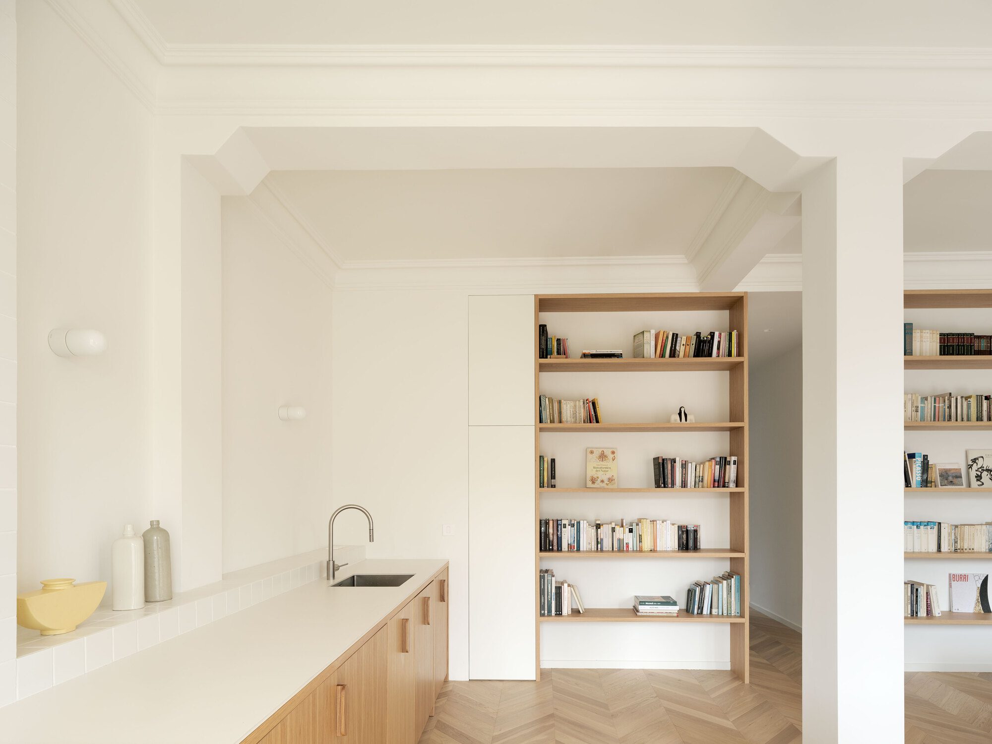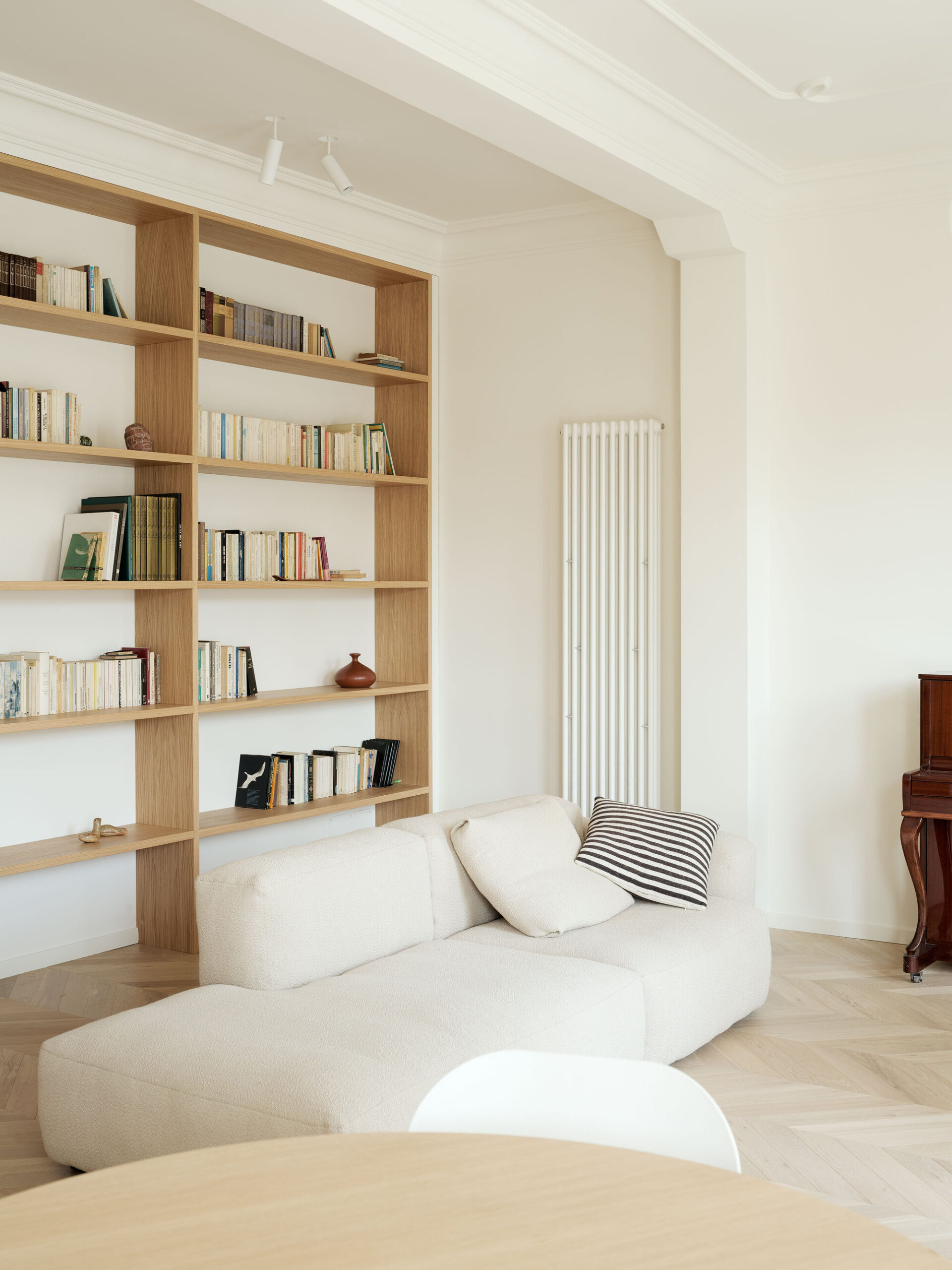 Special attention has been paid to the design of each integrated furniture element. Our studio designed the kitchen and shelves, as well as the dining table. These elements are made with oak plywood and finished with varnishes and natural oils. Every detail, from the design of the kitchen cabinet and its hand-made handles to the assembly of the shelving parts, has been carefully designed to give the space uniqueness.