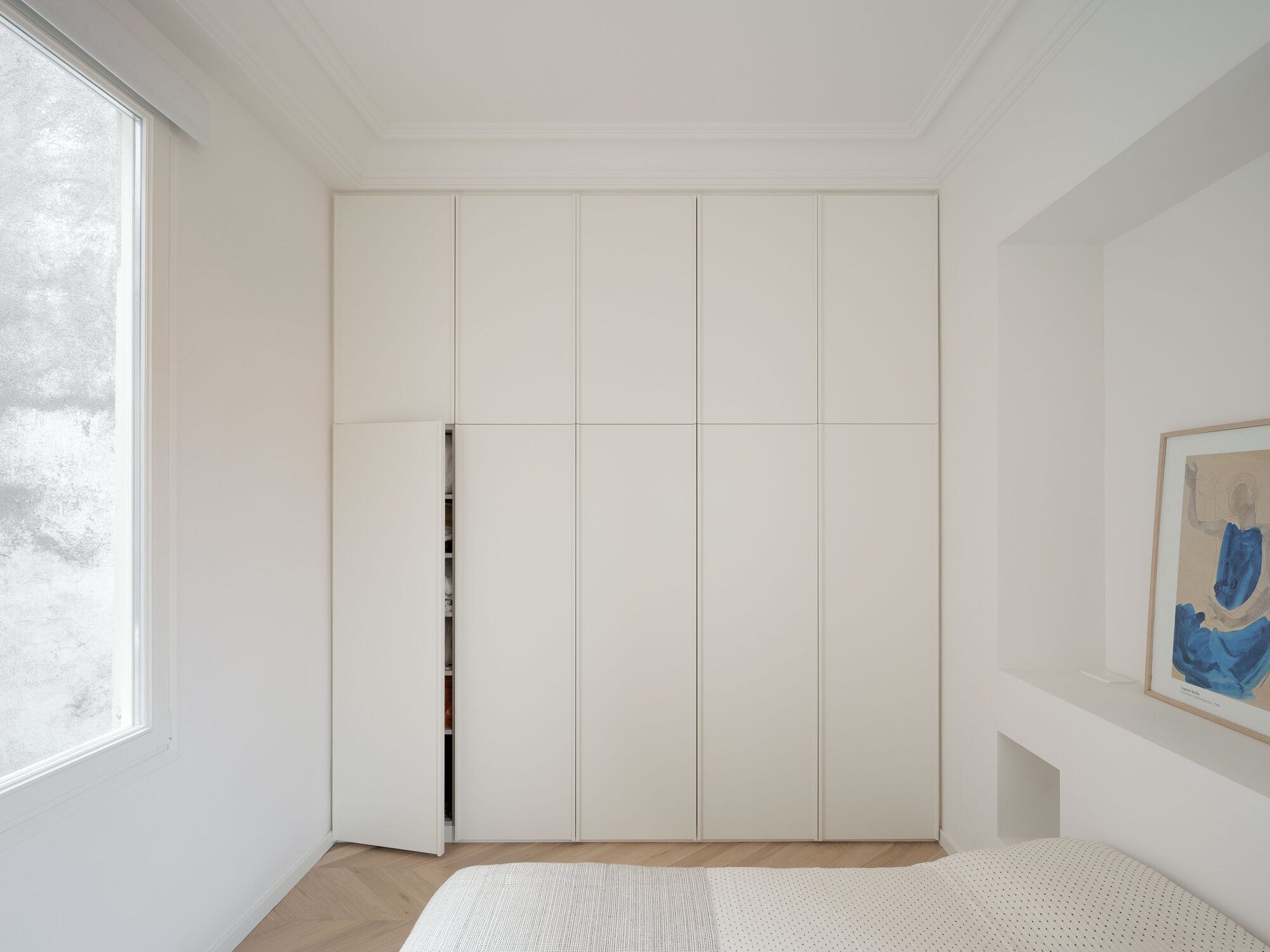 Excluding the bathroom, the color of the walls, as well as, the free-standing furniture elements of the project seek a neutral and soft line. The Hari chairs by Ondarreta in linen color and the Mags sofa by Hay in sand color bring serenity and comfort to the room. Each choice has been made to create a relaxed and welcoming atmosphere that complements the harmony of the entire project.