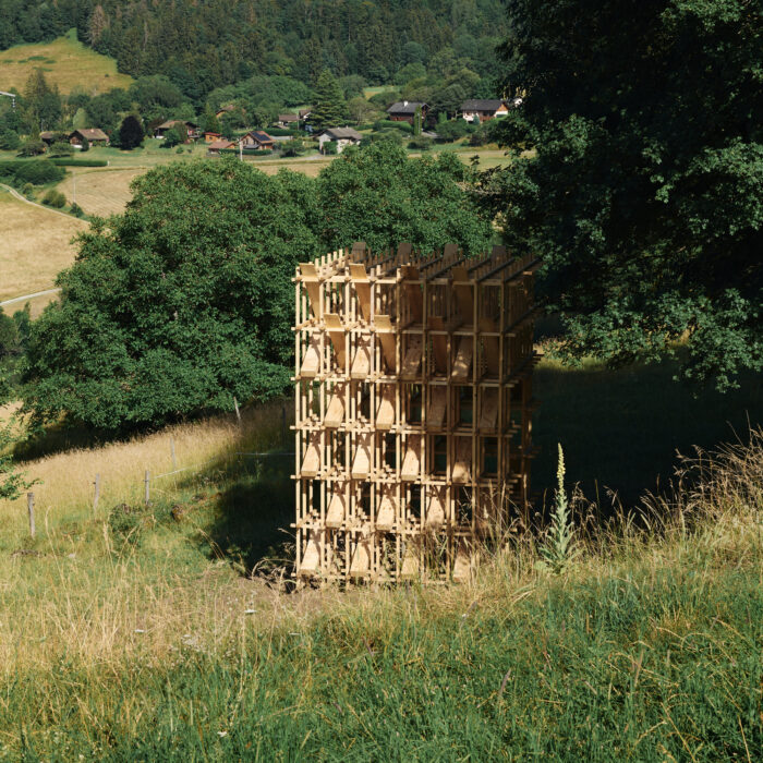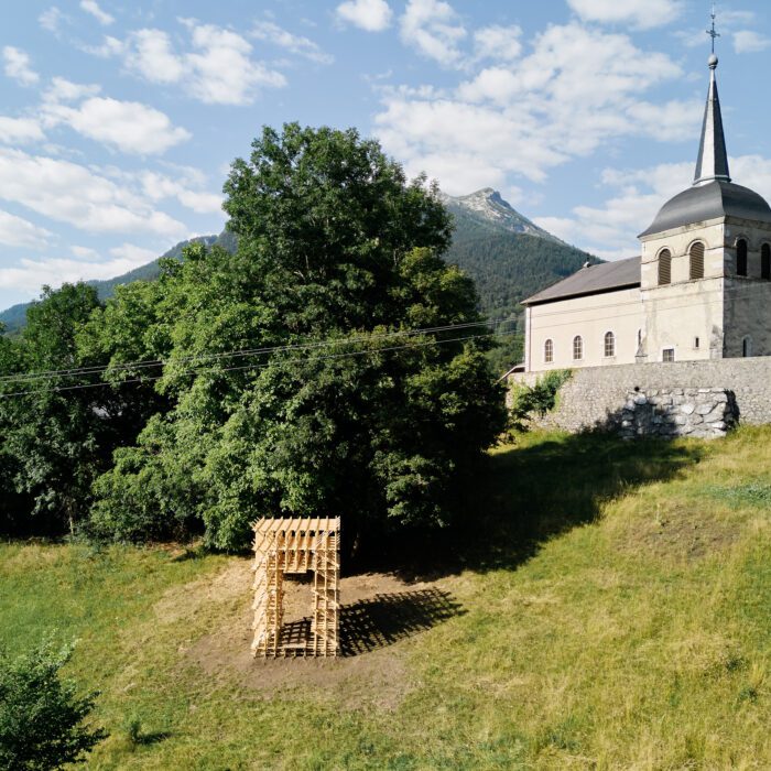 Ploc! is the onomatopoeia for the sound of two elements colliding. It also stands for Pluies LOCalisées. The Ploc hut is a portal, a passageway between this world and the sacred, between the domestic scale and the great landscape. Placed next to a church, its purpose is to extend the spiritual experience of the site by framing the mountain.