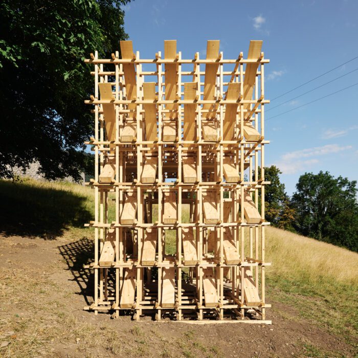 Ploc! Installation, Built as part of the competition for the Festival des Cabanes 2023 in the Annecy region, Ploc! is a reinterpretation of the Japanese fountain system known as shishi-odoshi.