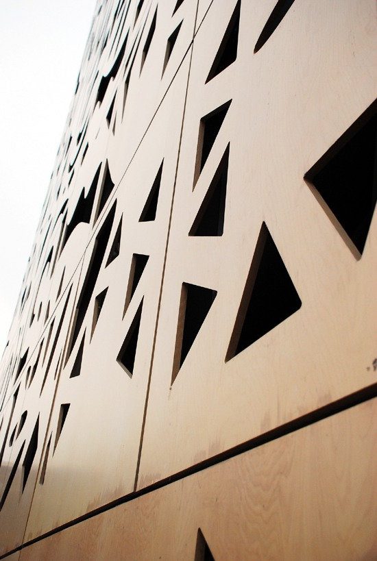 The entrance yard constitutes an integral part of the ground floor of the pavilion. The pattern of the exterior flooring divisions as well as the material used are continued inside the building. The form of outdoor and indoor furniture has been inspired by the elevation patterns. There is a concept of using the elements cut out from the elevation plywood for producing the furniture, in the form and material which will directly refer to the pavilion architecture.
