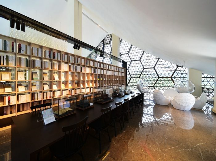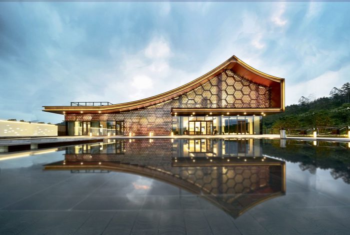 According to the characteristic of “external brick and internal stone” (a mixture of brick and stone in the wall) of traditional residence in southern Fujian, the form characteristics of tile screen are selected for the texture of the façade. Modern metal materials are used to create a unique style. At the same time, the curtain wall keel is transformed to integrate with external texture tightly, creating a changing light and shadow indoors with the shifting of time and light ray. The roof and wall naturally matching into an integral whole through red terracotta panels can display a sense of modern composition in a tile-mimetic color.